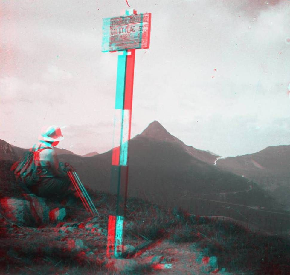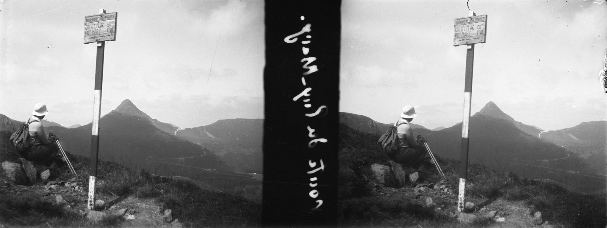 50 Fi 29, Randonneur sur le chemin du Puy Mary, contemplant les sommets cantaliens dont le Puy Griou