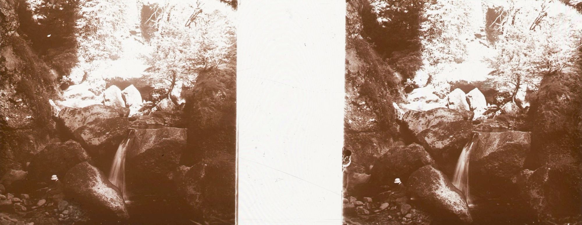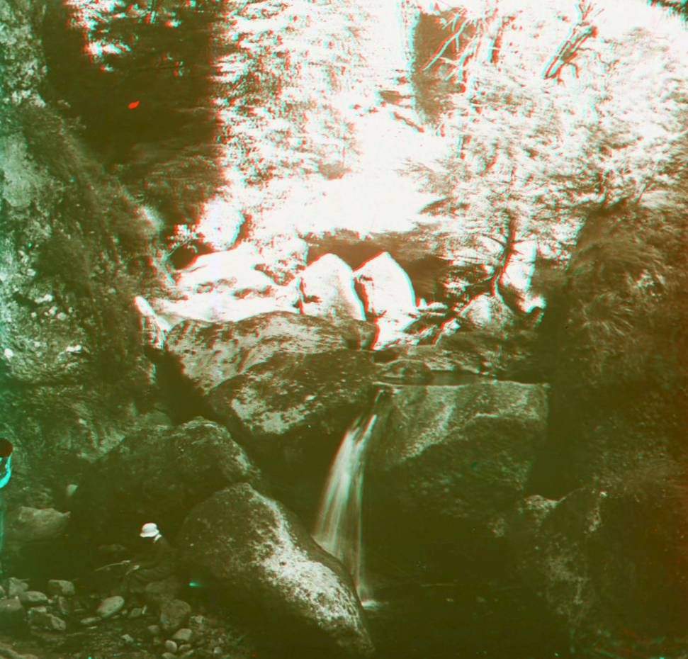50 Fi 77, Promeneur au pied d'une cascade des gorges de l'Alagnon près du Lioran