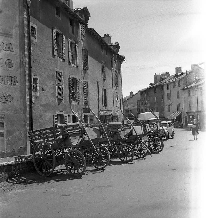 57 Fi 12, Carrioles garées le long d'une maison, près du marché d'Aurillac. - Négatif noir et blanc, 6 x 6 cm