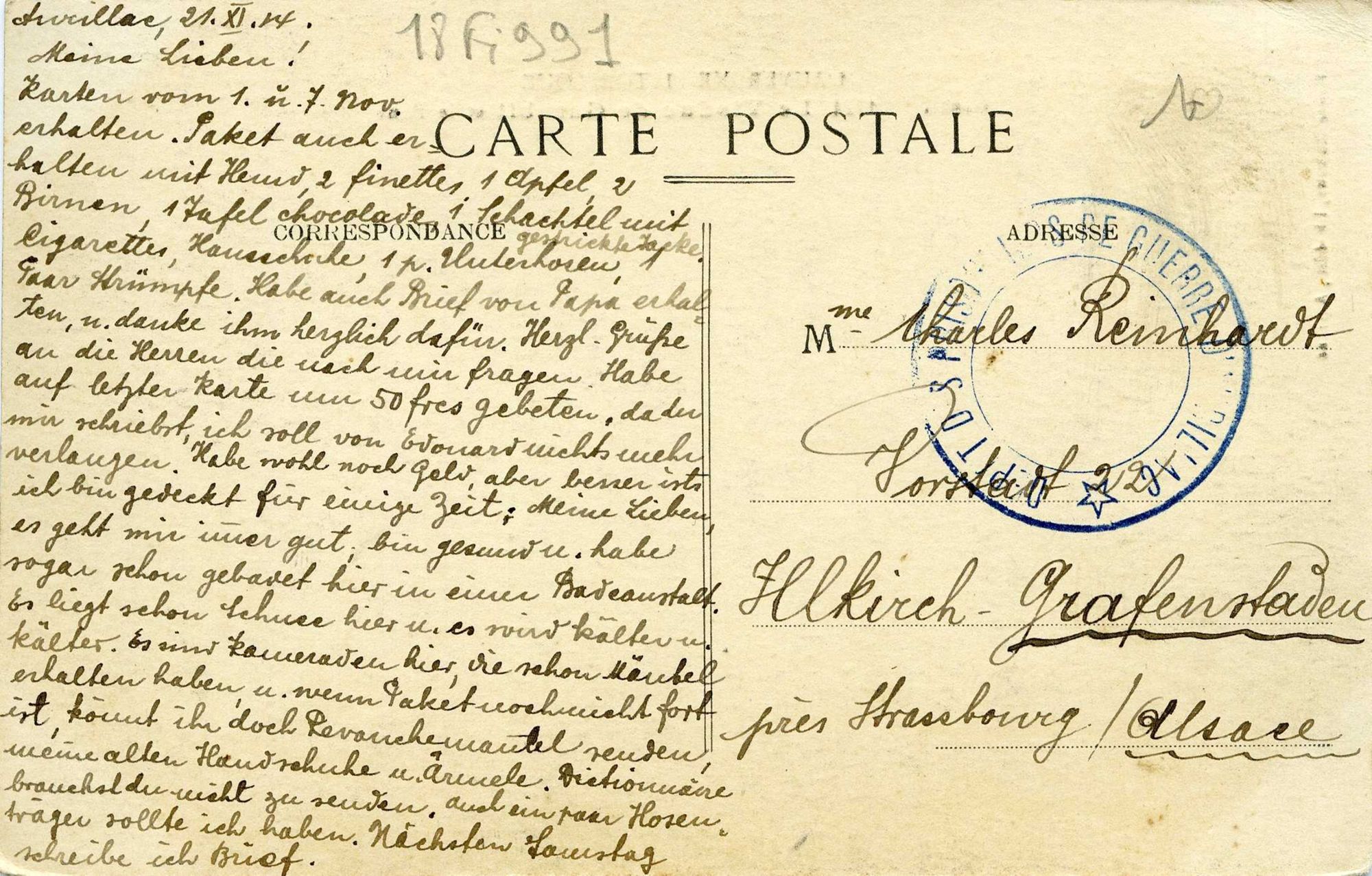 Carte écrite par Charles Reinhardt, prisonnier de guerre, à l'école Jean-Baptiste Rames d'Aurillac, adressée à son épouse à Illkirch-Graffenstaden près Strasbourg.