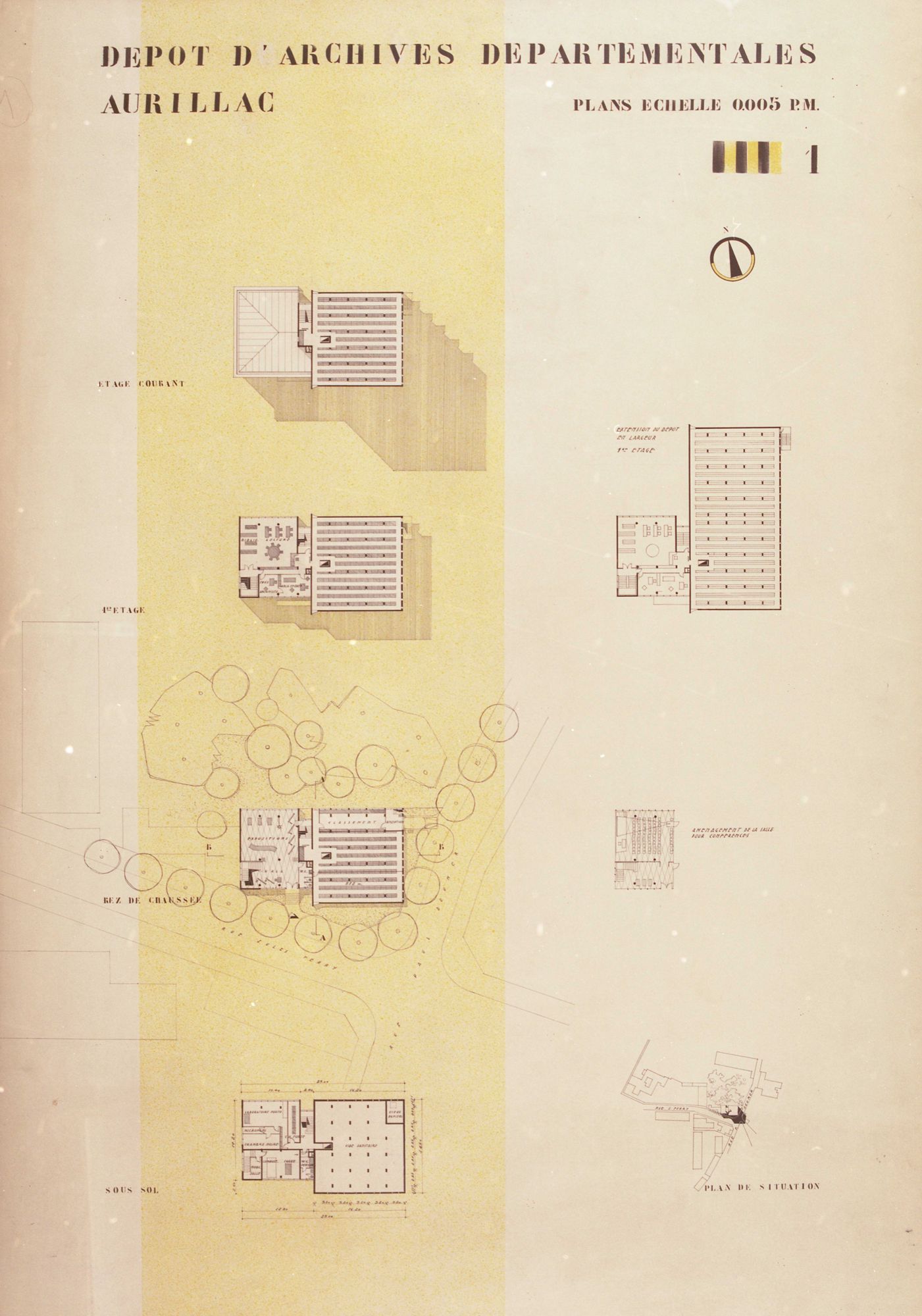 60 Fi 21, Plan récapitulatif avec plan d'étage courant, plan du 1er étage, plan du rez-de-chaussée, plan du sous-sol, plan de situation et plan d'aménagement de la salle de conférence