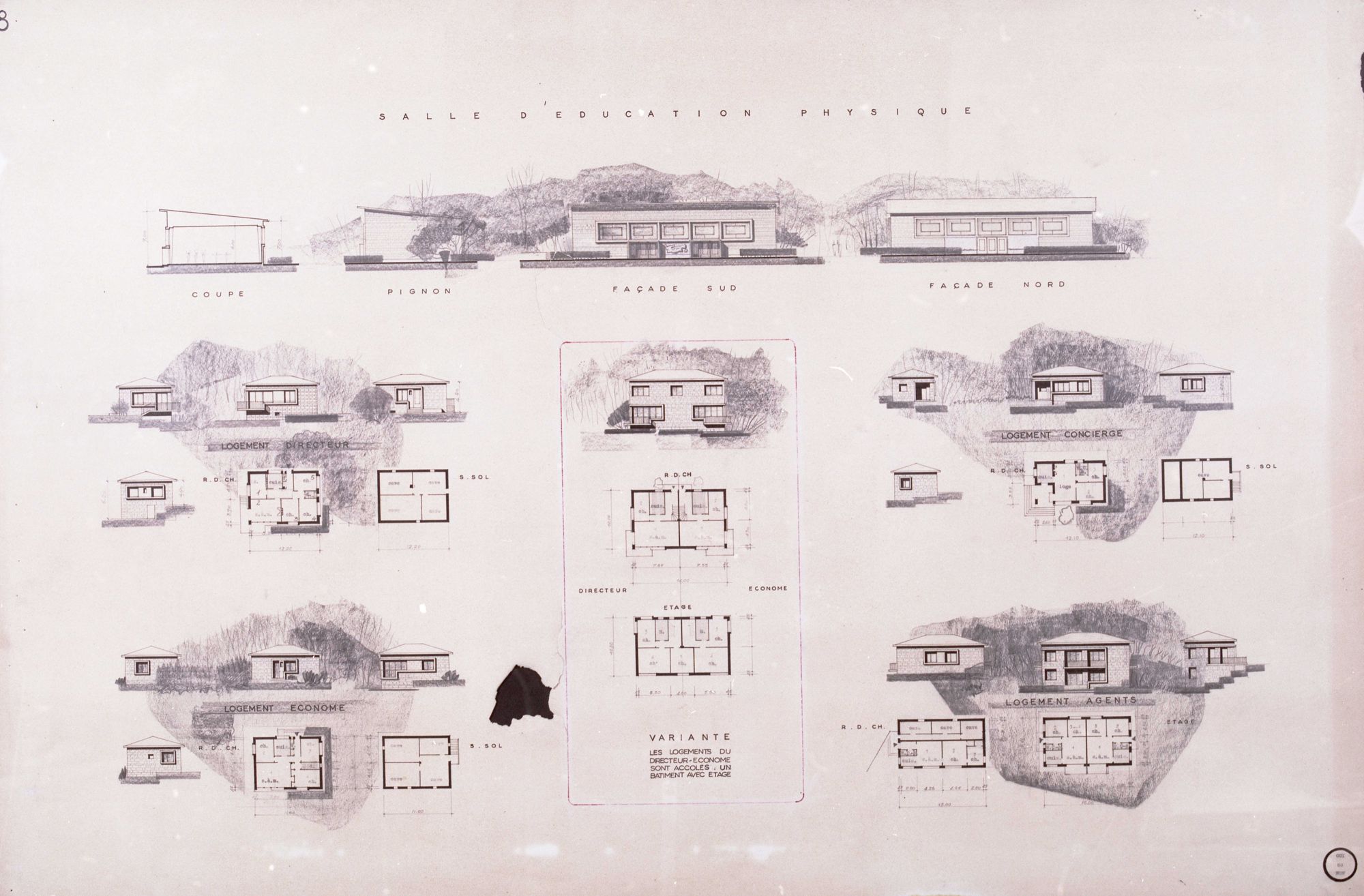 60 Fi 42, Salle d'éducation physique : coupe, pignon, façade sud et façade nord ; logements du directeur, de l'économe, du concierge et des agents