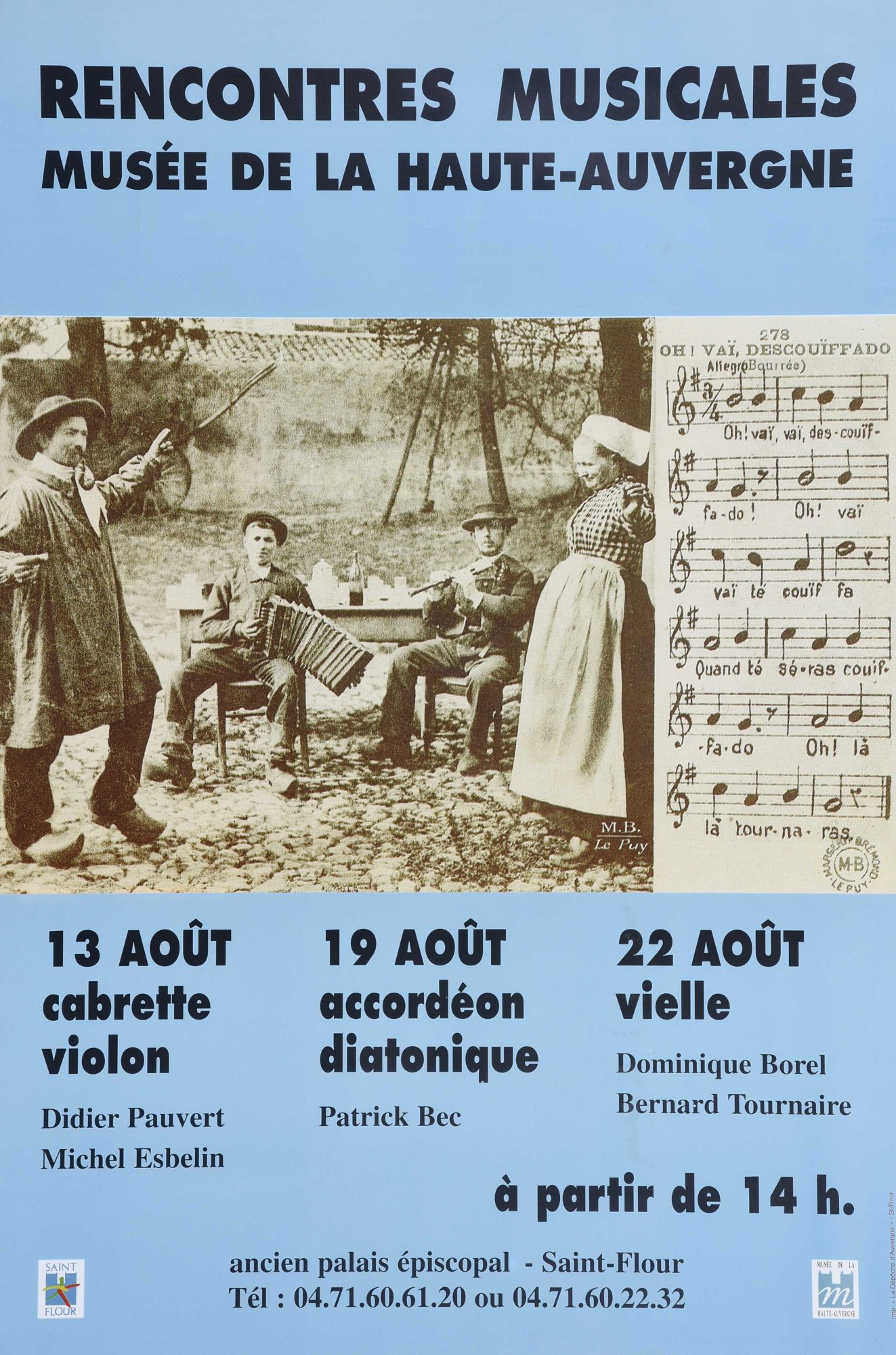 61 NUM 757-758, "Rencontres musicales" au musée de la Haute-Auvergne. Cabrette, violon, accordéon, vielle. Les 13, 19 et 22 août 1997. - Saint-Flour : Impr. La Dépêche.61 NUM 757-758, "Rencontres musicales" au musée de la Haute-Auvergne. Cabrette, violon, accordéon, vielle. Les 13, 19 et 22 août 1997. - Saint-Flour : Impr. La Dépêche.