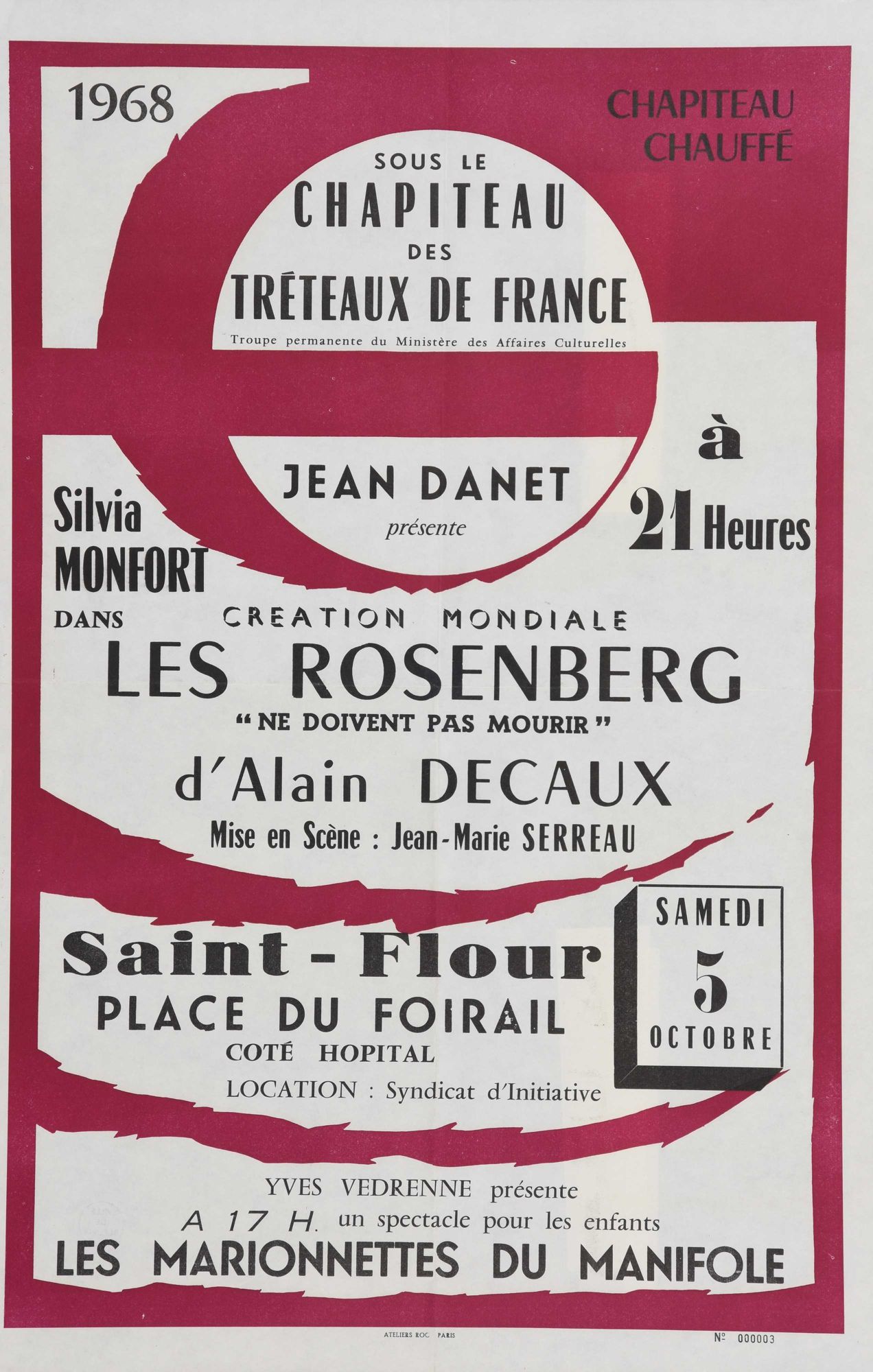 61 NUM 837, "Sous le chapiteau des Tréteaux de France", Jean Danet présente : "Les Rosenberg ne doivent pas mourir" d'Alain Decaux. Yves Vedrenne présente le spectacle "Les Marionnettes du Manifole". Place du foirail, 5 octobre 1968. - Paris : Ateliers Roc.