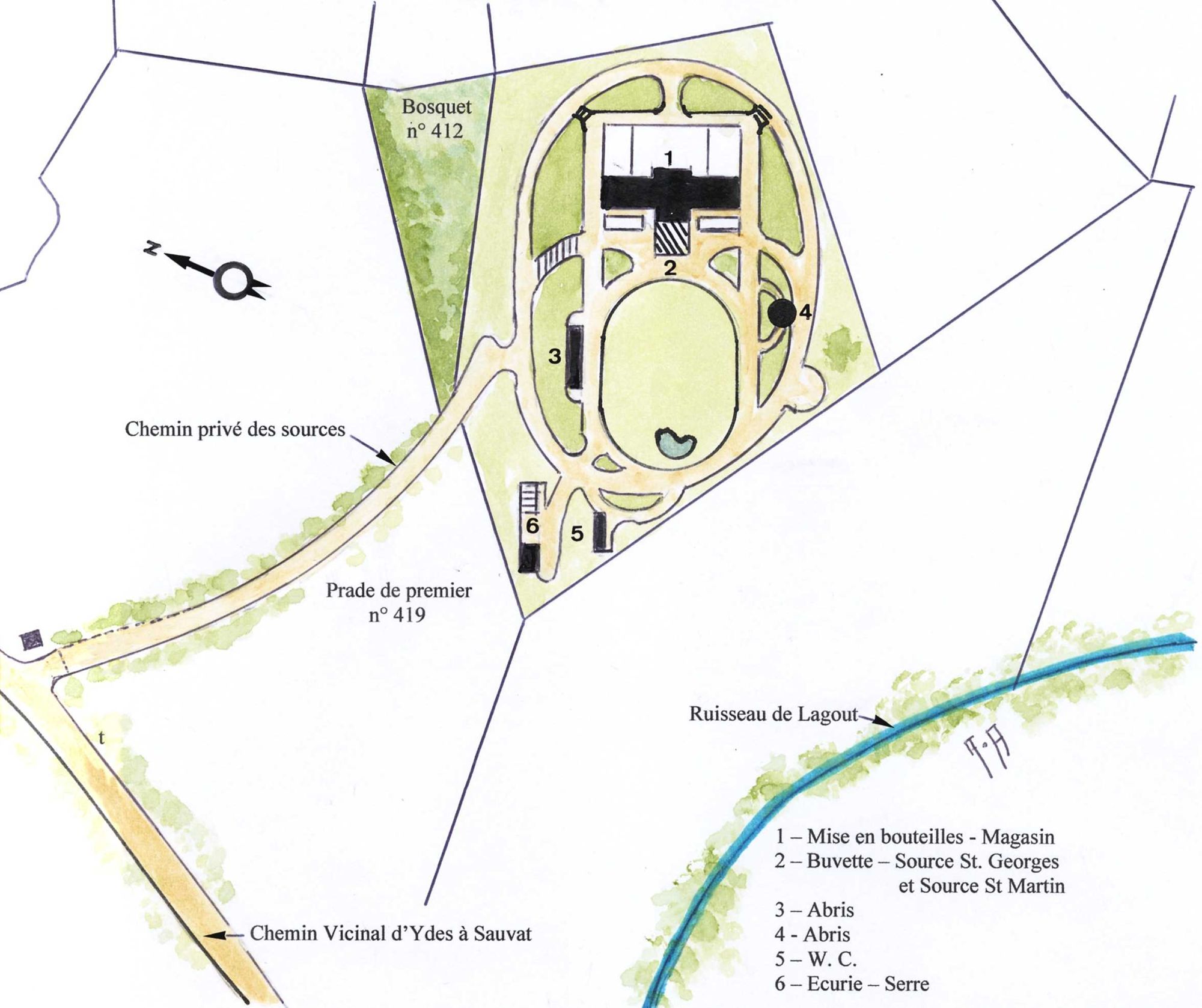 67 NUM 20, Plan de l'établissement et du parc des eaux minérales de la Jarrige en 1901 (d'après les archives Louis de Ribier), signé André Avrard.