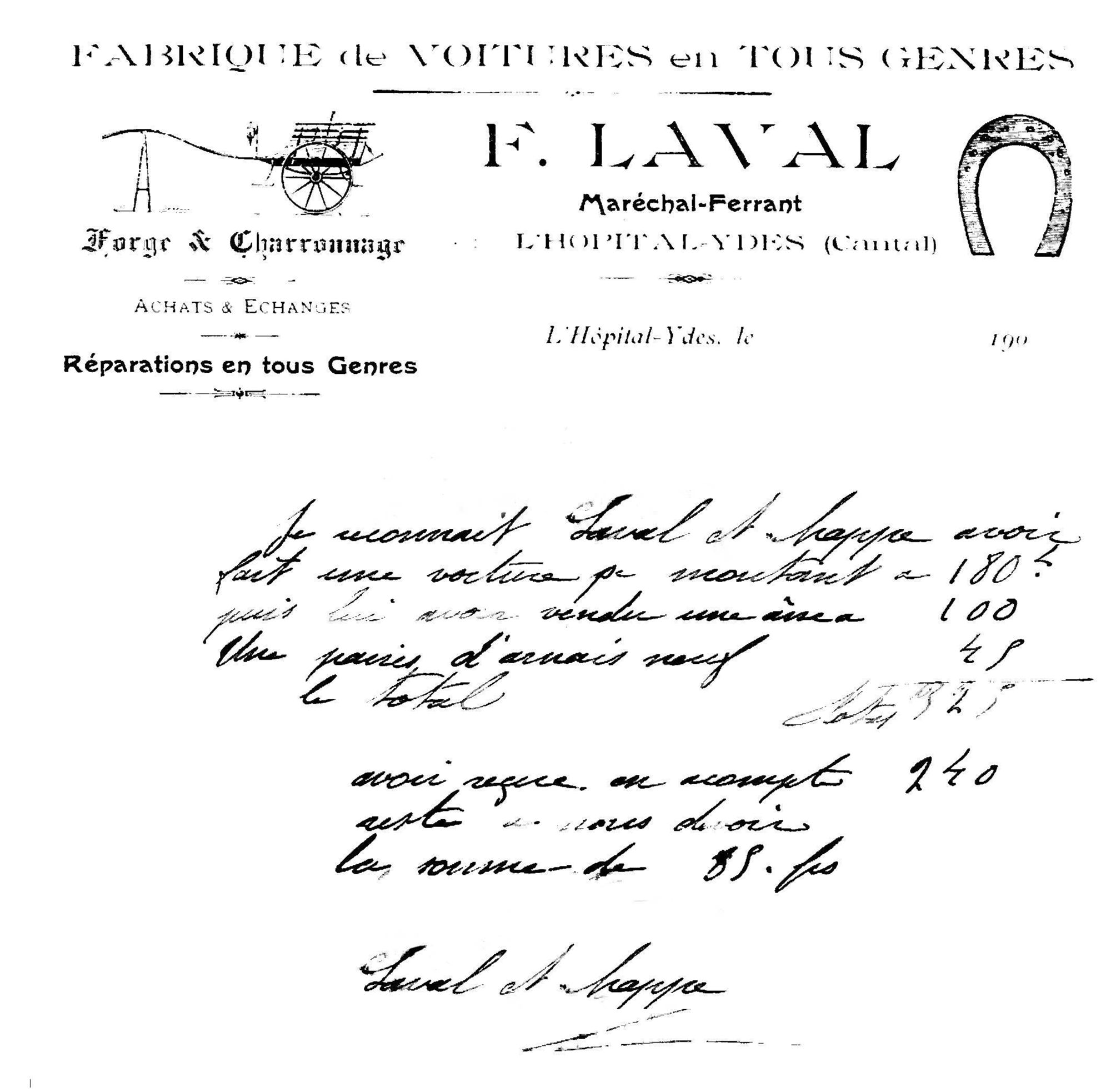 67 NUM 107, Papier à en-tête du maréchal-ferrant Laval, fabriques de voitures en tout genre, à Ydes.