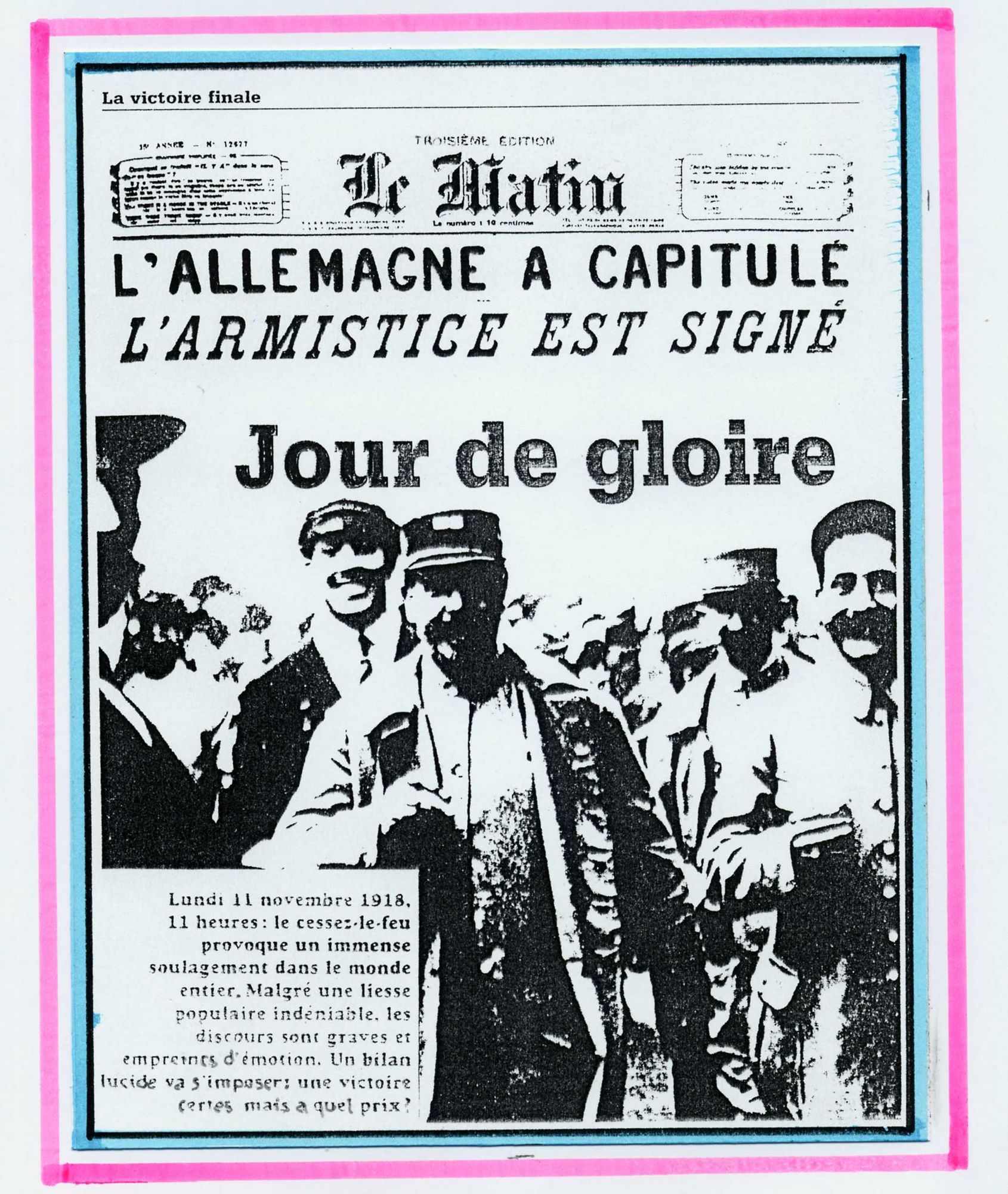 67 NUM 195, Reproduction de la "Une" du journal Le Matin annonçant la capitulation de l'Allemagne et la signature de l'armistice.