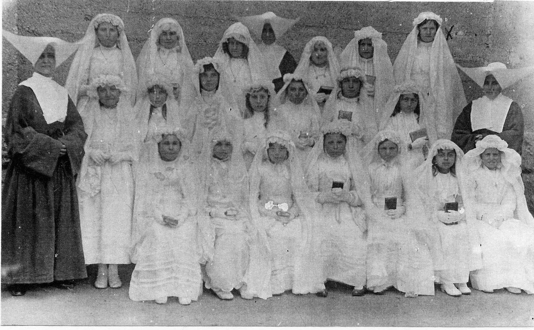67 NUM 232, Paroisse de l'Hôpital-Ydes : photographie d'un groupe de communiantes entourées des sœurs de saint Vincent de Paul.