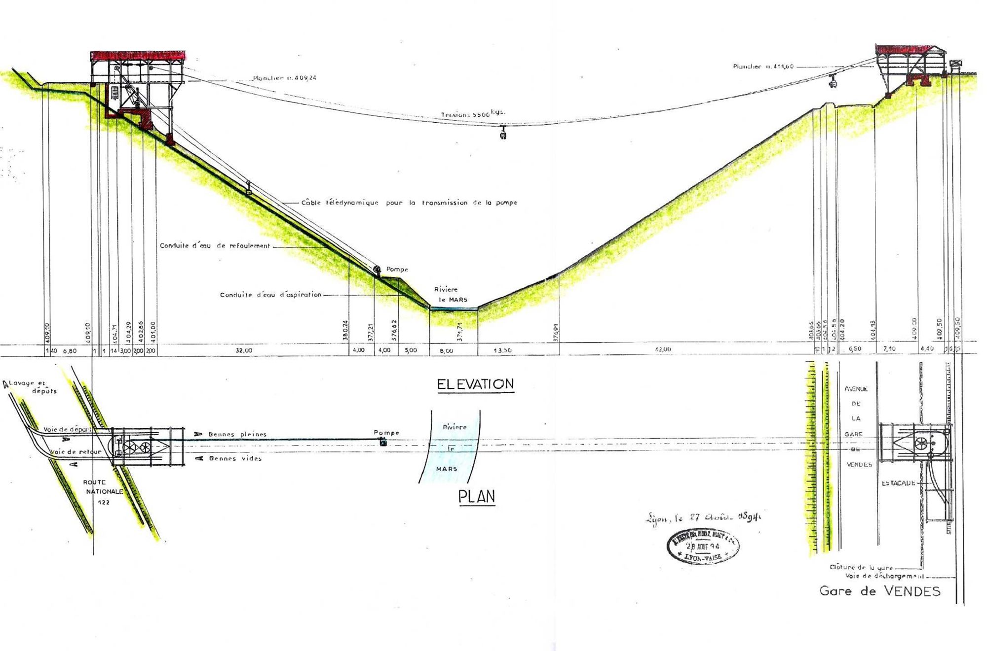 67 NUM 967, Plan et élévation du système de porteur, d'une longueur de 200 mètres et d'une hauteur de 40 mètres, reliant la mine de Champleix à la gare de Vendes.