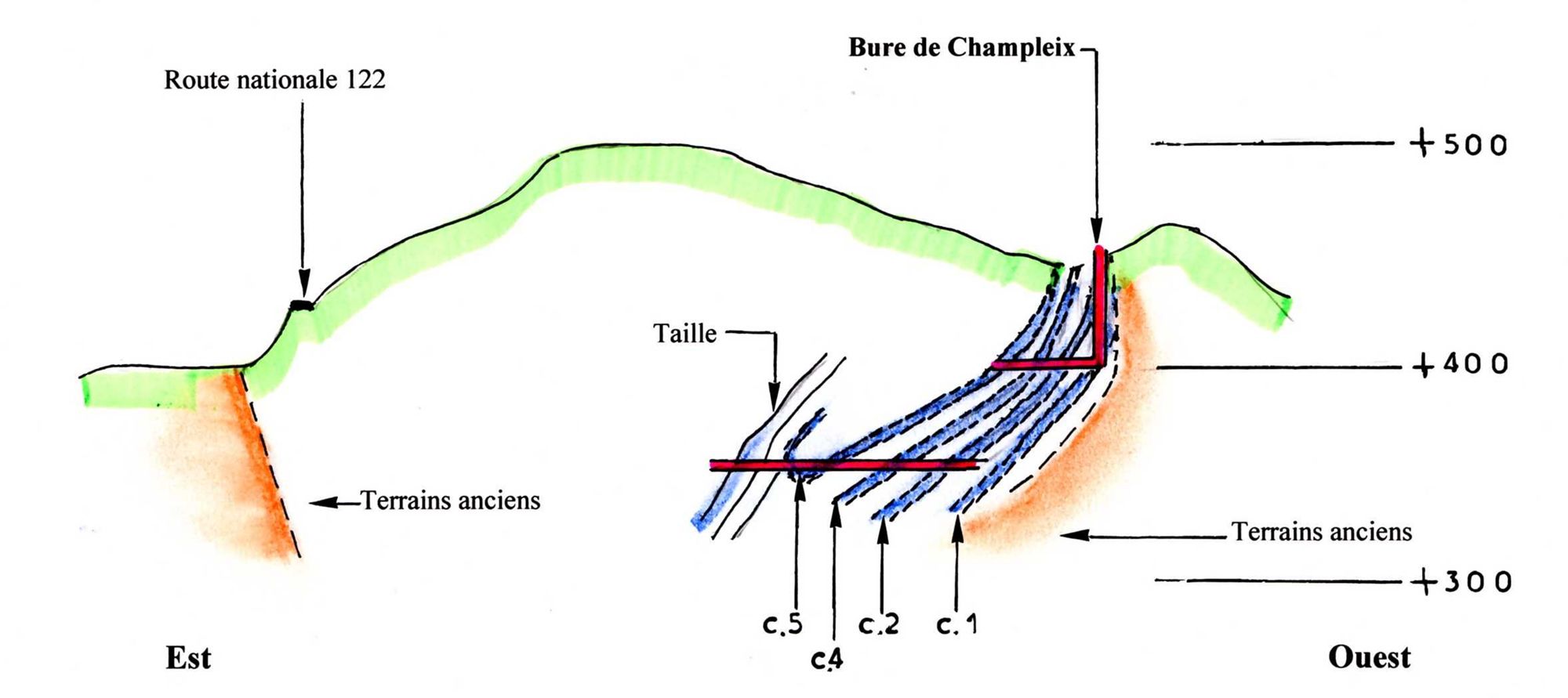 67 NUM 972, Coupe du gisement de Champleix en 1940-1945 à 400 mètres au sud du puits, signé André Avrard.
