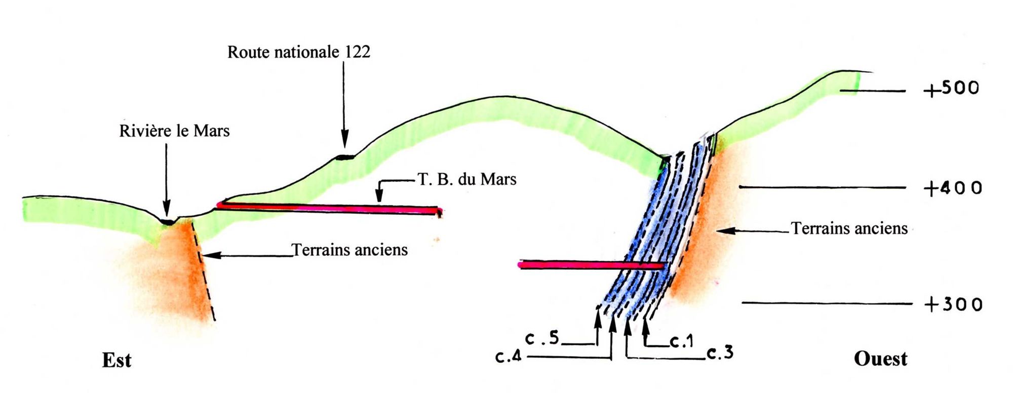 67 NUM 973, Coupe du gisement de Champleix en 1940-1945 à 700 mètres au sud du puits, signé André Avrard.
