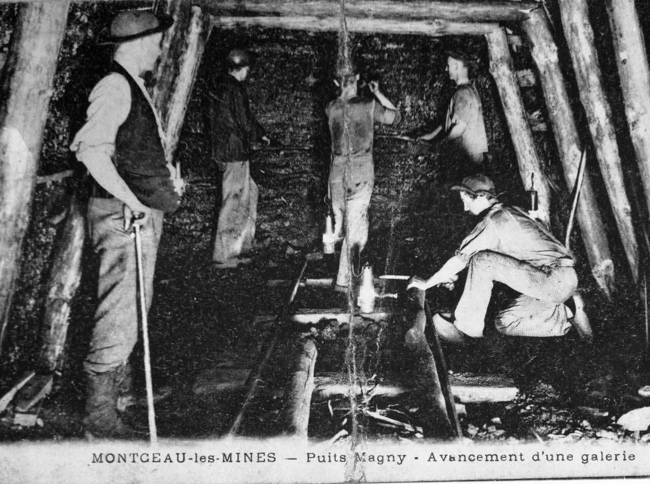 67 NUM 1025, Reproduction d'une carte postale : "Montceau-les-Mines - Puy Magny - Avancement d'une galerie".