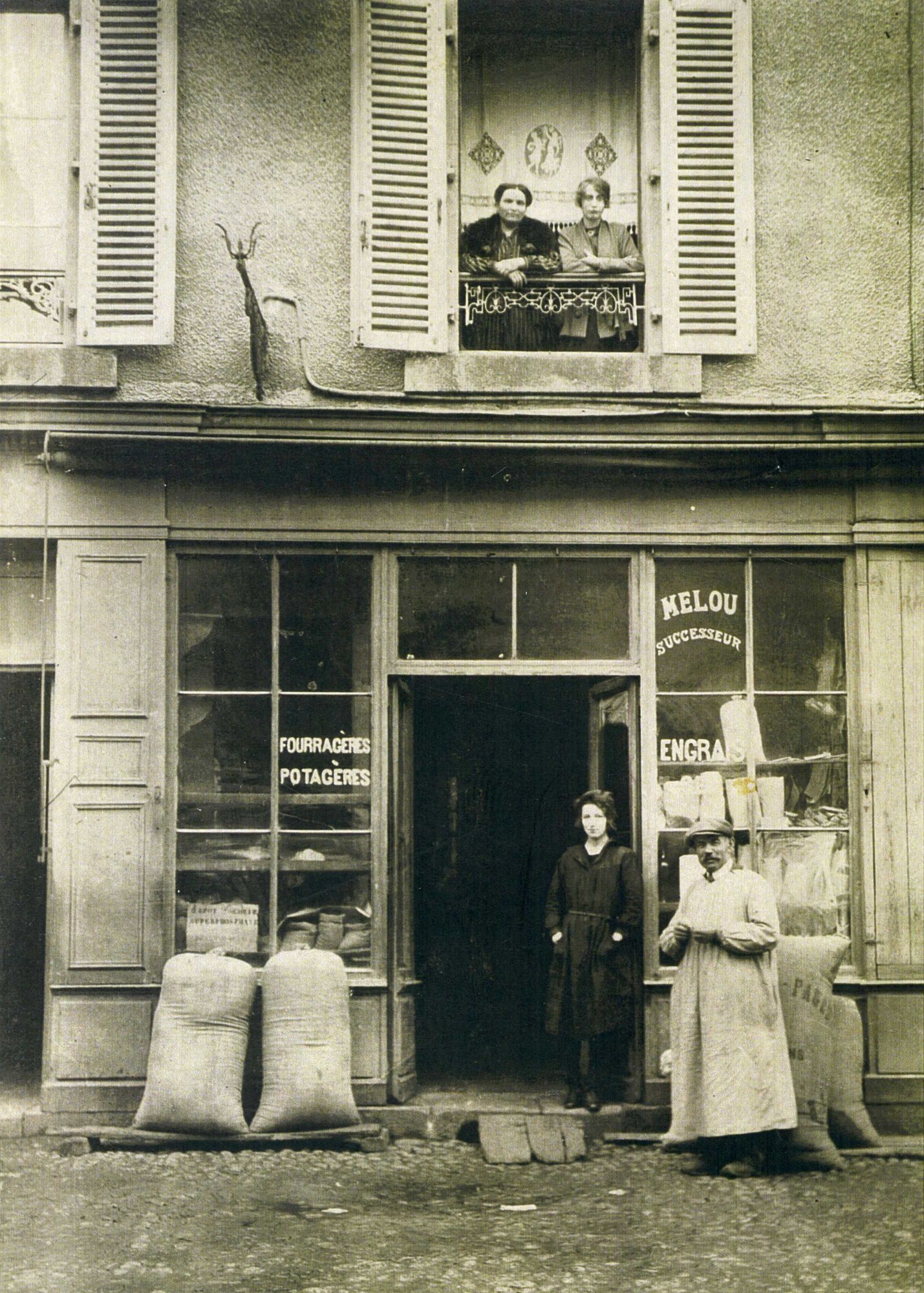 6 NUM 15/1, Façade du magasin Melou au 49, rue des Carmes (fourragères, potagères, engrais, sel). Un homme et une femme en blouse prennent la pose à la porte ; au premier étage, deux femmes apparaissent à la fenêtre. Des sacs de grain sont posés devant la façade. - Noir et blanc, [1920]