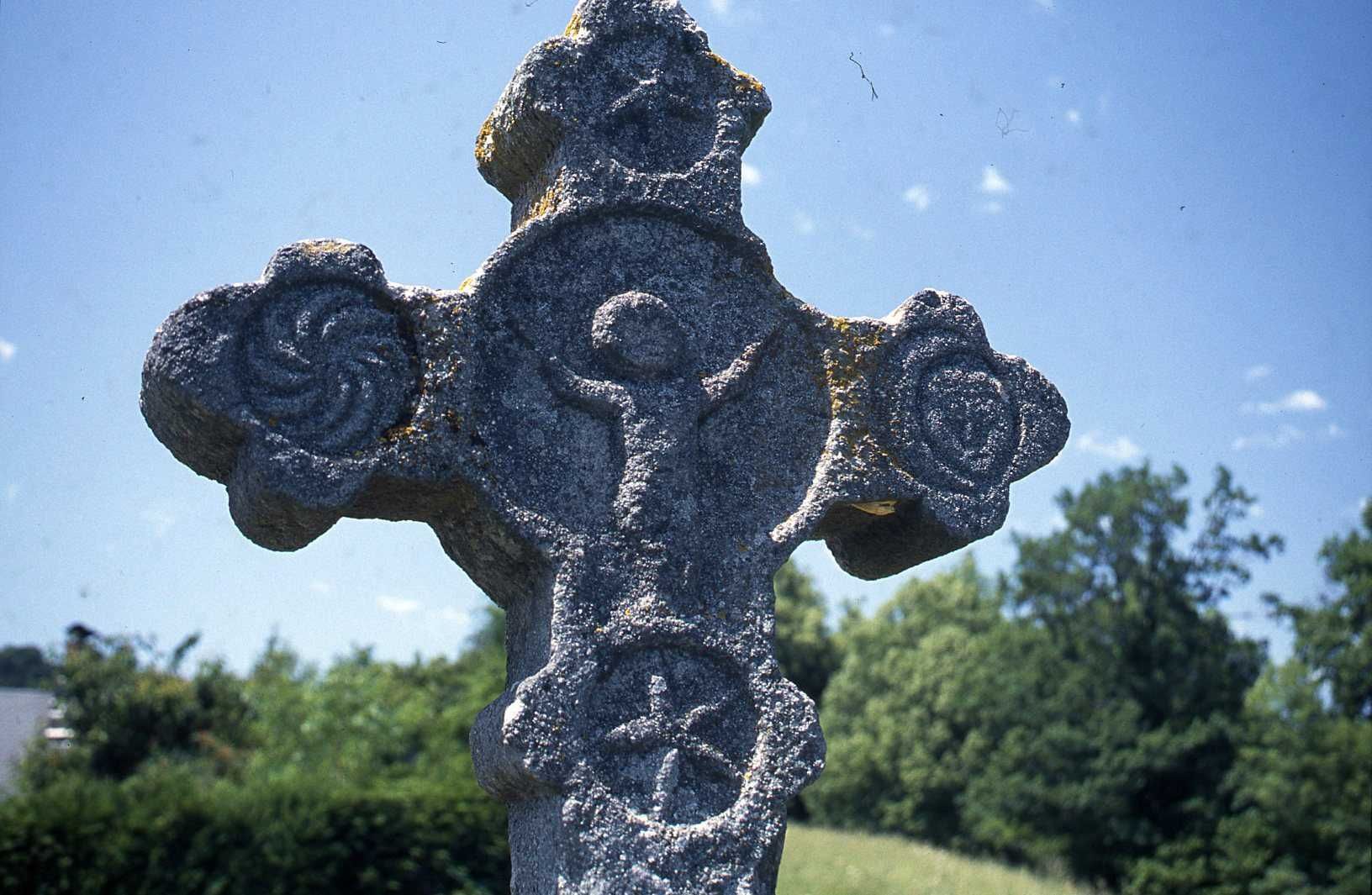 72 Fi 1016, Avers du croisillon : Christ en croix dans un disque central, repésentations du soleil, de la lune et d'étoiles à cinq branches.
