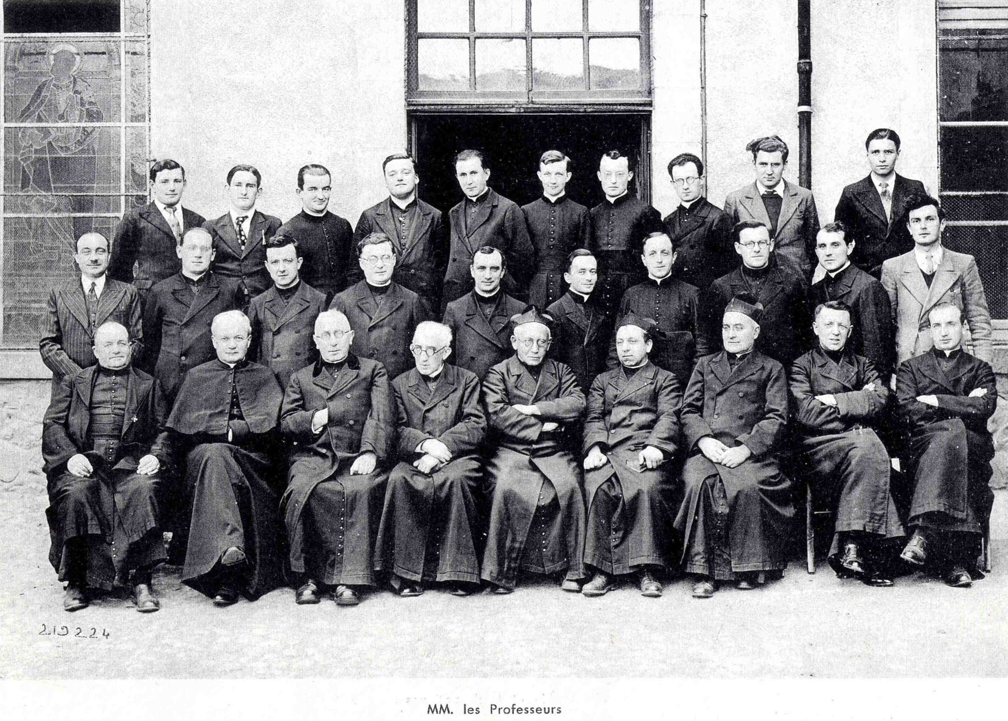 76 Fi 1, Reproduction de photographie : "MM. Les professeurs" : au premier rang en partant de la gauche : 1er Abbé Gély, 3e Abbé Albessard, 5e Abbé Lathélize, supérieur de Saint-Eugène et 6e Abbé Vidal, supérieur de Saint-Paul ; au deuxième rang en partant de la gauche : 6e Abbé Jean Mazières. - Cliché anonyme. - 19,5 x 28 cm