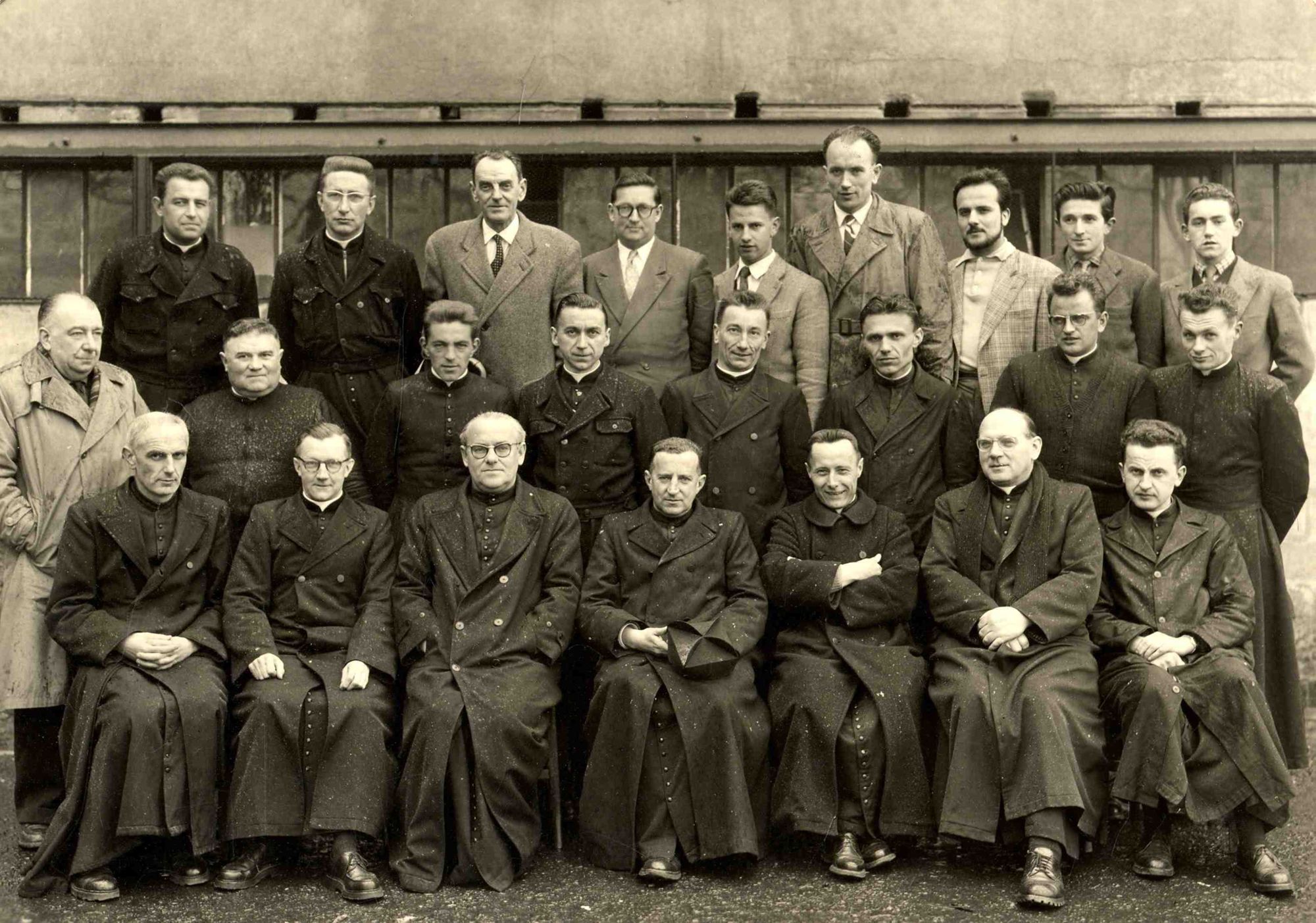 76 Fi 1-39 - Collection Abbé Delfour : photographies des professeurs et élèves de l'Institution Saint-Eugène à Aurillac - 1937-1968 76 Fi 19 - Les professeurs : en partant de la gauche, au premier rang, 1e abbé Petit, 4e abbé Bonhoure, au deuxième rang, 5e abbé Delfour et 6e abbé Marcel Auriant. - Cliché Photographie Universitaire Rayjane. - 18 x 24 cm - 1959 76 Fi 19, Les professeurs : en partant de la gauche, au premier rang, 1e abbé Petit, 4e abbé Bonhoure, au deuxième rang, 5e abbé Delfour et 6e abbé Marcel Auriant. - Cliché Photographie Universitaire Rayjane. - 18 x 24 cm Cote 76 Fi 19 Date 1959 Mots-clés lieu Aurillac (Cantal, France) -- Institution Saint-Eugène Mots-clés matière Prêtre Professeur Elève Institution Saint-Eugène Mots-clés personne Bonhoure (abbé) Petit (abbé) Auriant, Marcel (abbé) Delfour, Jean Clément (abbé) Permalien de la notice https://archives.cantal.fr:443/ark:16075/a011382517548LS1cWI.moteur=arko_default_5fbd06a9ae86c