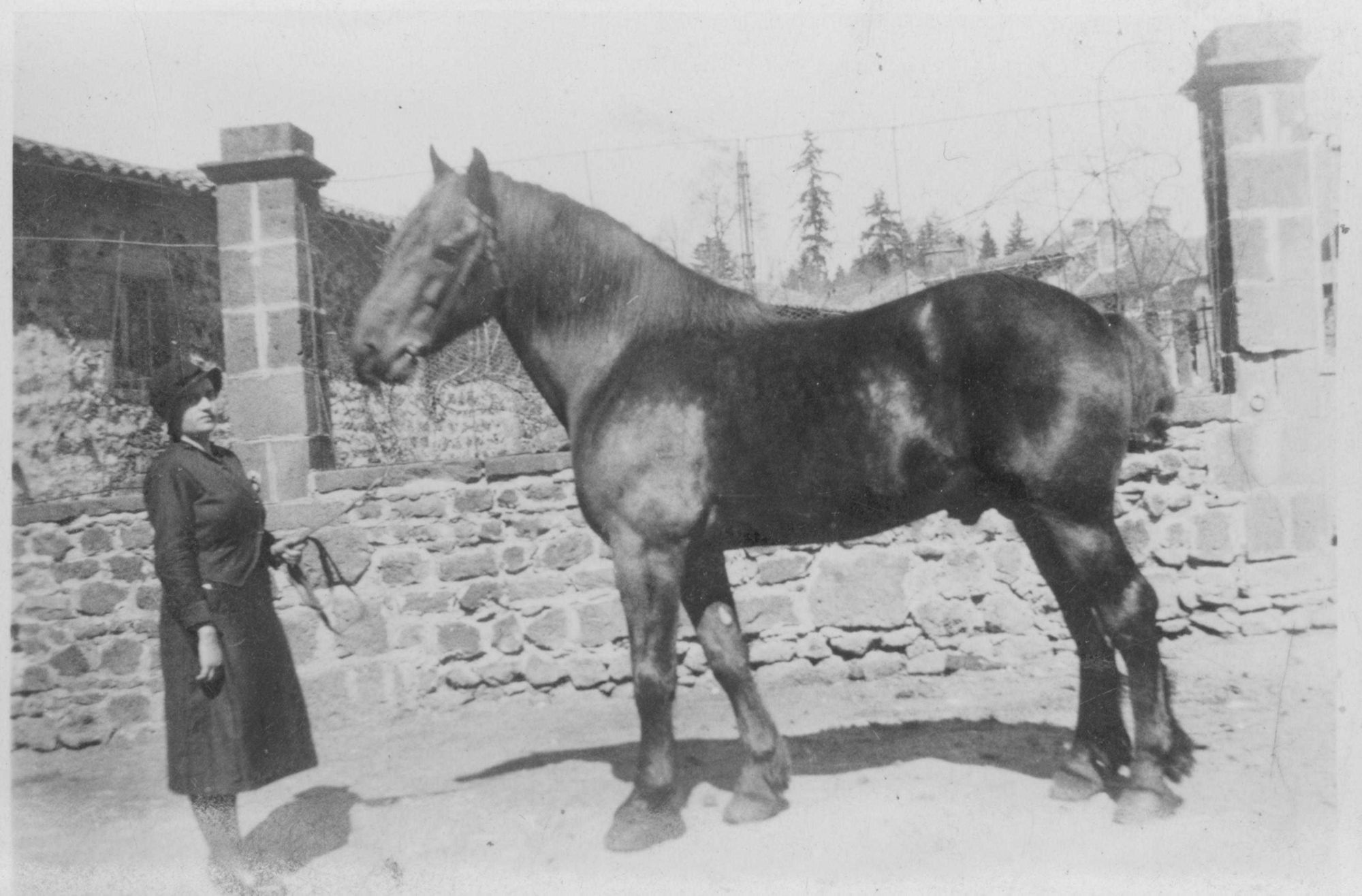 77 NUM 12, Femme tenant un étalon par les rênes.