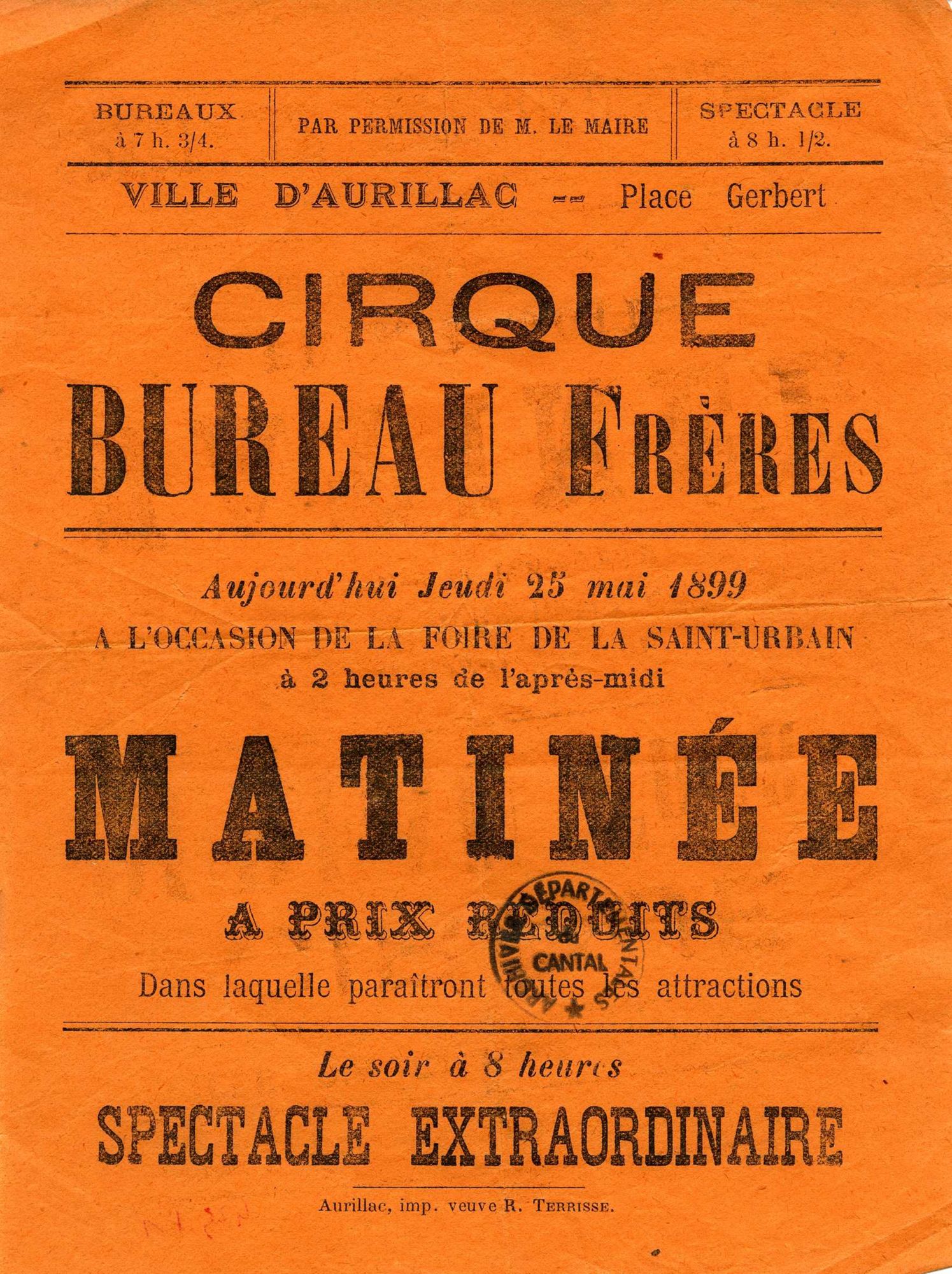 Le cirque Bureau constituait, pour les enfants d'Aurillac du début du XXe siècle, une distraction appréciée. Ce prospectus de 1899, mentionné dans l'inventaire parmi des "papiers divers trouvés dans le dépôt", est une trace précieuse de ce divertissement dont les archives sont fuyantes, à l'image du chapiteau qui déménage tous les jours ou presque.