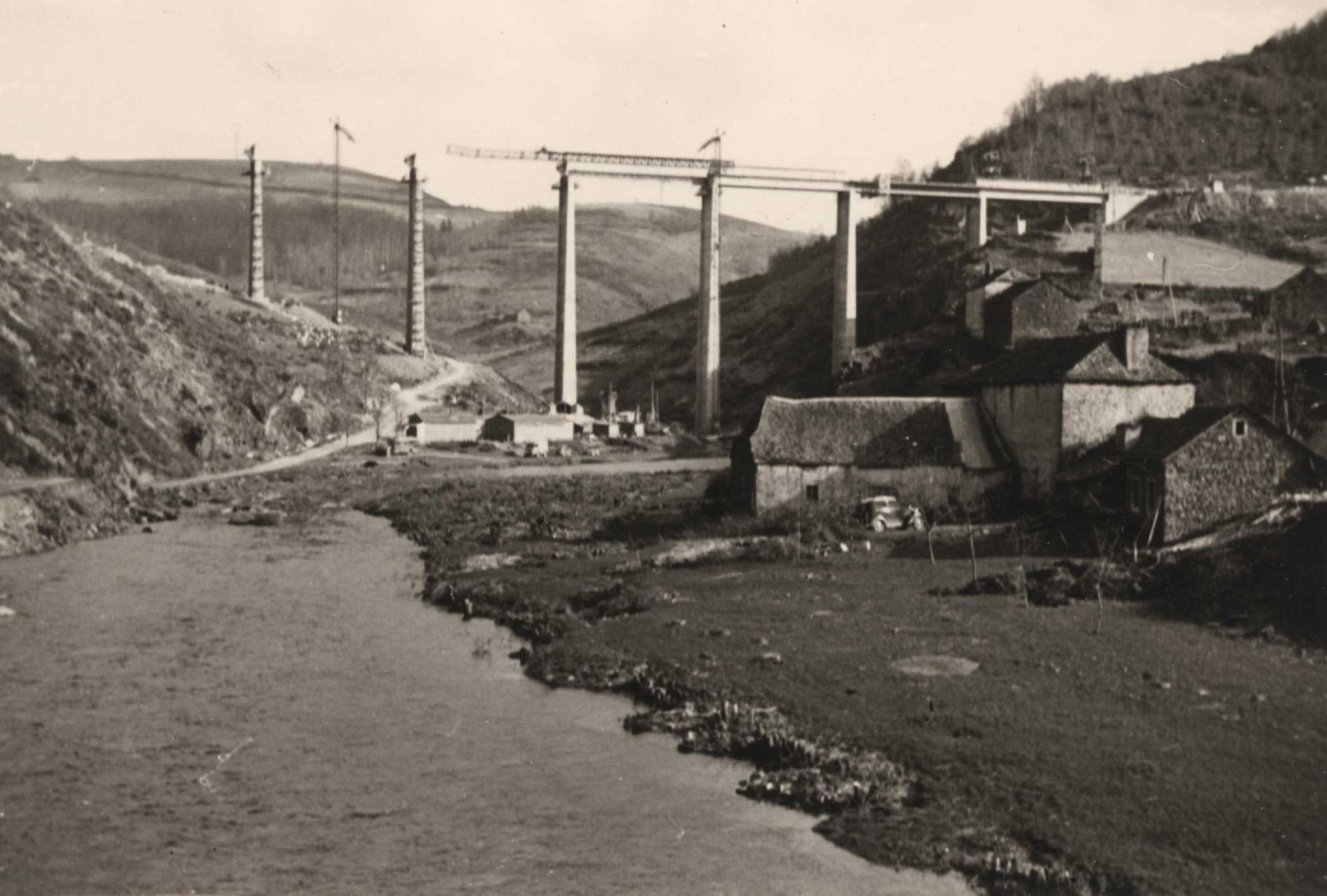 89 Fi 536, Construction du viaduc de Mallet et le village, avant la mise en eau du barrage de Grandval.
