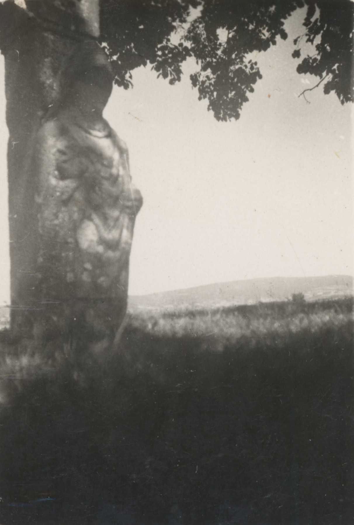 89 Fi 1183, Croix de la Chaumette : personnage sur le fût représentant un évêque.