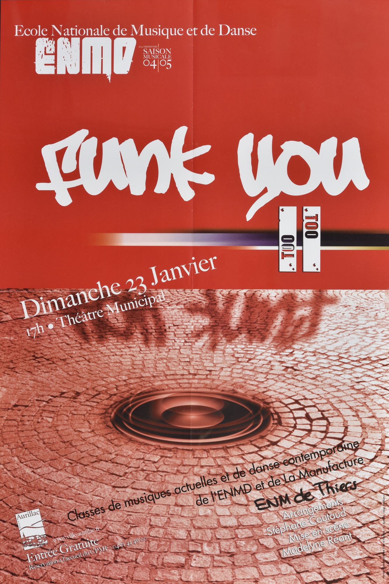 96 Fi 24, "Ecole Nationale de Musique et de Danse. Saison musicale 04/05. Funk you. Dimanche 23 janvier 17 h. Théâtre municipal" / Service communication Ville d'Aurillac - G. Audifax (imprimerie Del Barco).
