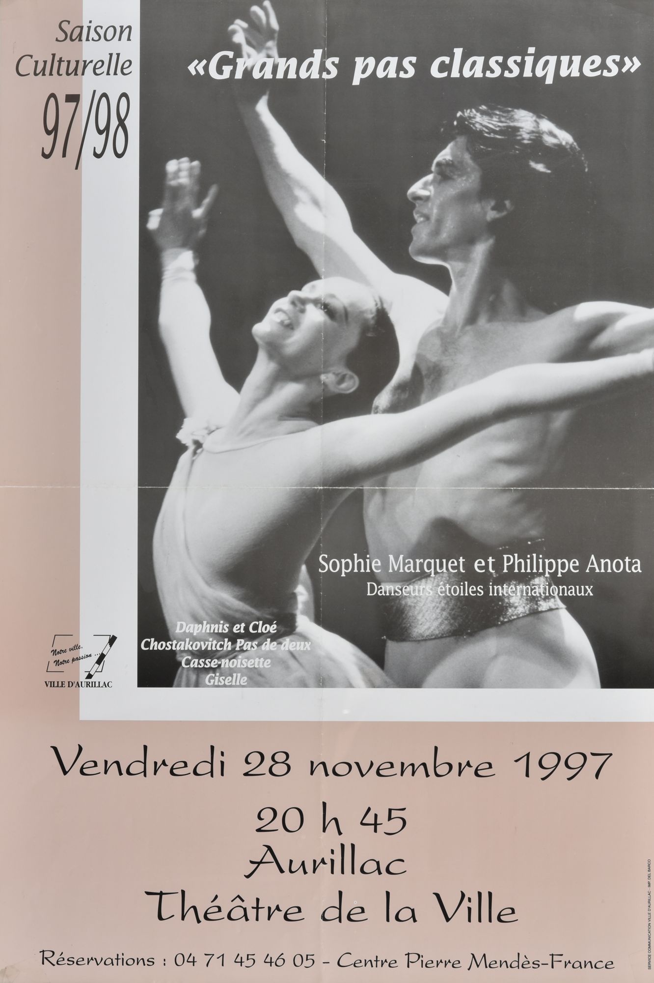 96 Fi 25, "Saison culturelle 97/98. "Grands pas classiques". Sophie Marquet et Philippe Anota, danseurs étoiles internationaux. Vendredi 28 novembre 1997 20 h 45 Aurillac Théâtre de la ville" / Service communication Ville d'Aurillac (imprimerie Del Barco).