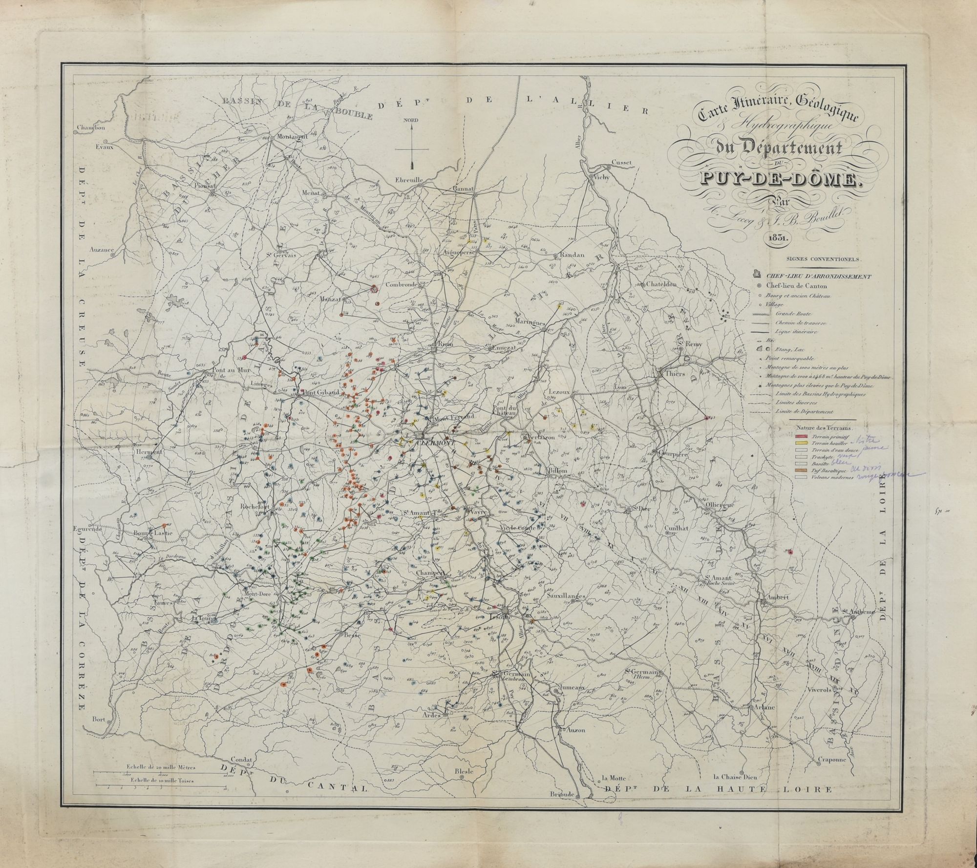28 J 1/14, "Carte itinéraire, géologique, hydrographique du département du Puy-de-Dôme, par H. Lecoq et J.-B. Bouillet. 1831". - 49 x 55 cm.