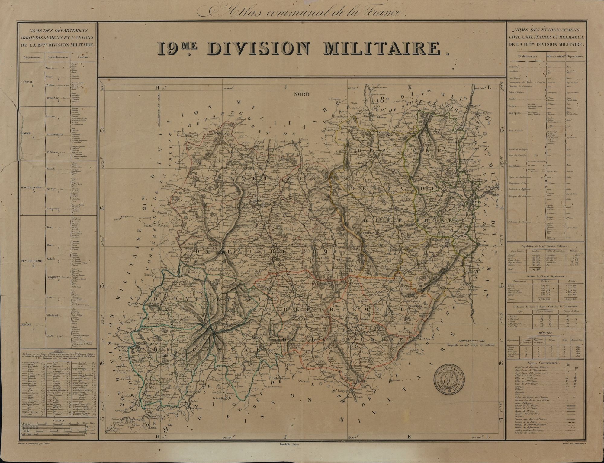 28 J 1/25, Carte de la 19e division militaire (Cantal, Loire, Haute-Loire, Puy-de-Dôme, Rhône), dessinée par Charle, gravée par Dumortier. - S. d., 48 x 62 cm.