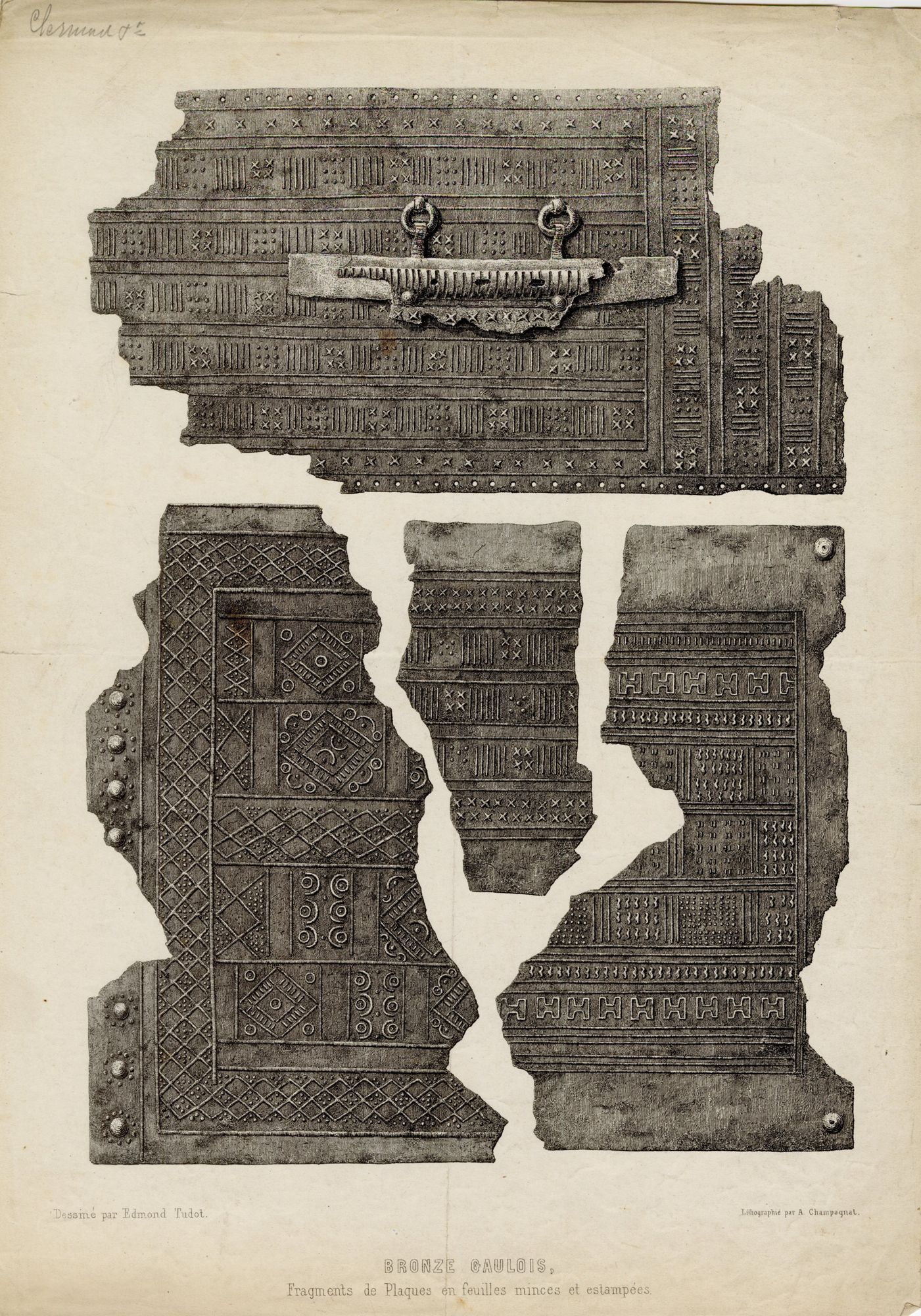 28 J 1/1-560 ; 28 J 2/1-450 ; 28 J 3/1-26 - Fonds Alphonse Aymar - 1282-1927 Cartes et documents figurés (formats supérieurs à 24 x 30 cm) Documents figurés classés par matière Archéologie gauloise 28 J 1/51 - Bronzes gaulois, dessinés par Edmond Tudot, lithographiés par André Champagnat.. - 35 x 25 cm. - Sans date 28 J 1/51, Bronzes gaulois, dessinés par Edmond Tudot, lithographiés par André Champagnat.. - 35 x 25 cm. Cote 28 J 1/51 Date Sans date Mots-clés lieu Gaule Mots-clés matière Archéologie Lithographe Dessinateur Mots-clés personne Champagnat, André (lithographe) Tudot, Edmond Aymar, Alphonse (1865-1927) Permalien de la notice https://archives.cantal.fr:443/ark:16075/a011489666464gWha8E.moteur=arko_default_5fbd06a9ae86c