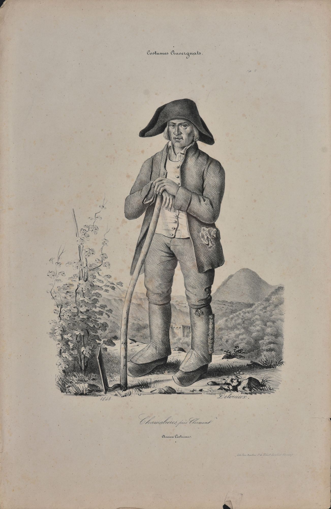 144-149. Hommes : 144-146. Lithographie Paris-Beaulieu, sieur de Thibaut-Landriot, Clermont-Ferrand. - 48 x 31 cm ; 144. "Chamalières, près Clermont" (1843) ; 145. "Mont d'or, village des Bains" ; 146. "Environs de Brioude" ; 147. "Métayer de Néronde, près Thiers". - 40 x 26 cm ; 148. "Canton de Langeac". - 37 x 26 cm ; 149. "A la Nobre, environs de Latour". - 36 x 25 cm ;