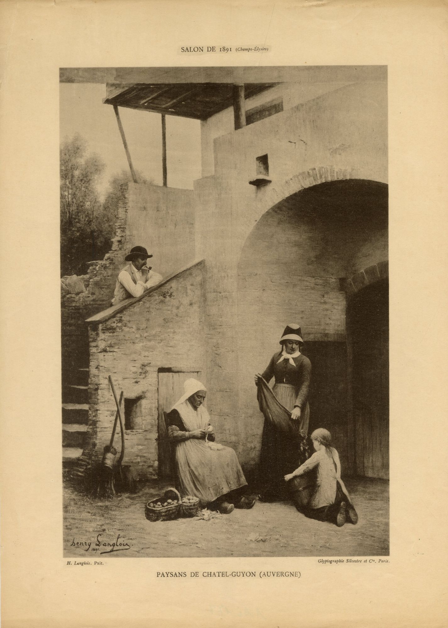 28 J 1/177, "Paysans de Châtel-Guyon (Auvergne)" : homme, deux femmes, fillette. - Peinture Henry Langlois, 1891 ; glyptographie Silvestre et Cie, Paris. - 35 x 25 cm.