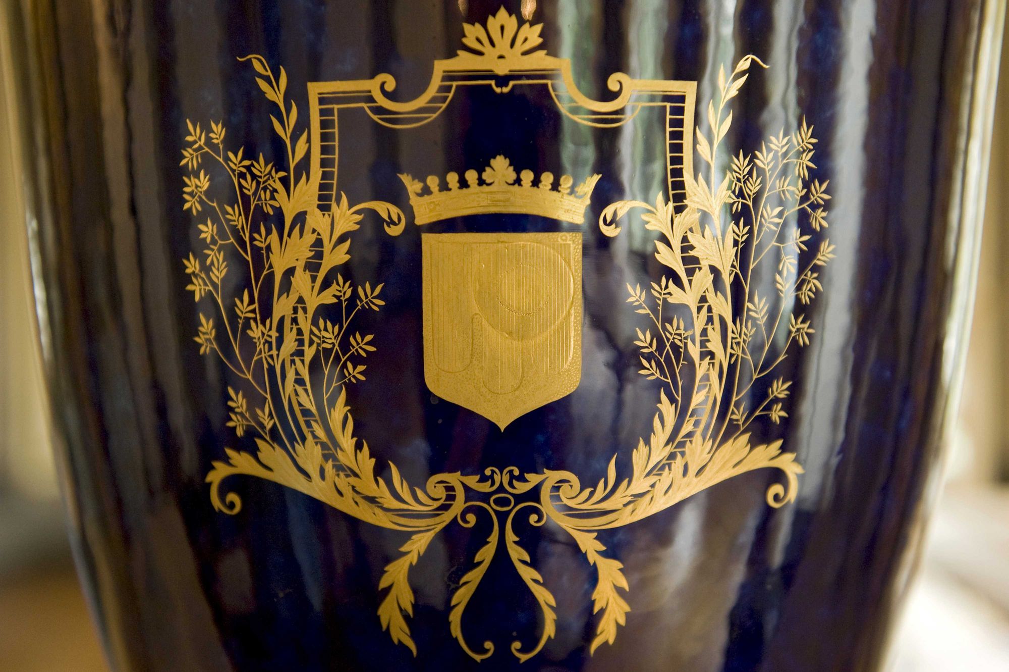 41 NUM 56, Grand vase bleu et or aux armes de l'Auvergne : détail des armoiries
