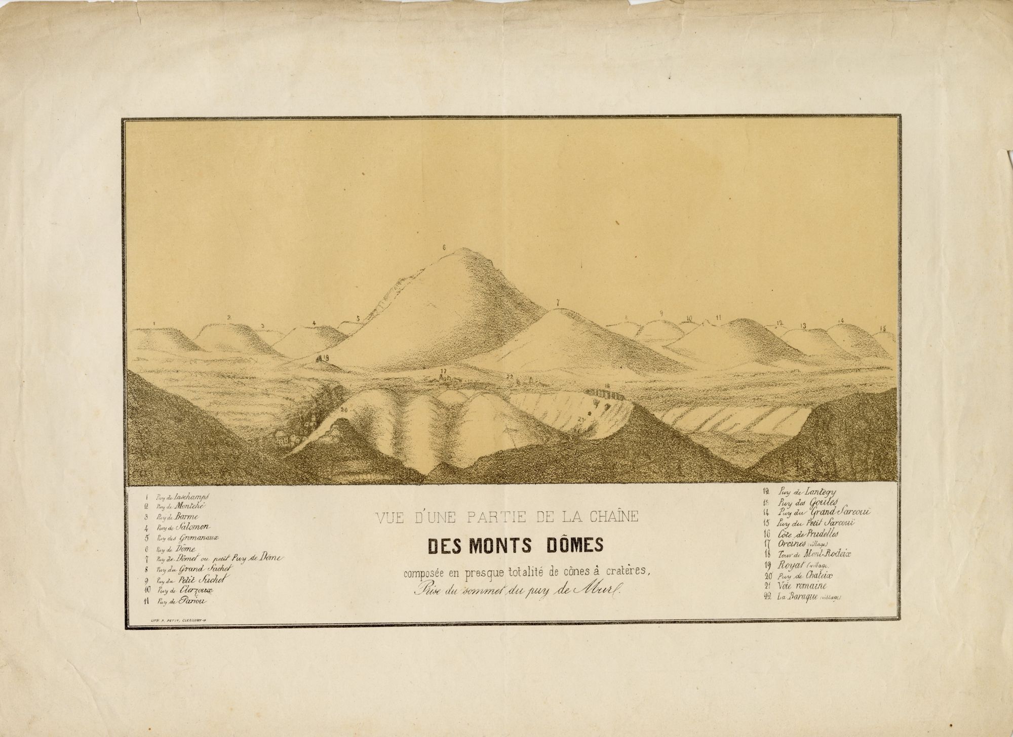 250. "Vue d'une partie de la Chaîne des Monts Domes, composée en presque totalité de cônes à caractères, prise du sommet du puy de Mur". - Lithographie P. Petit, Clermont-Ferrand. - 29 x 40 cm ;