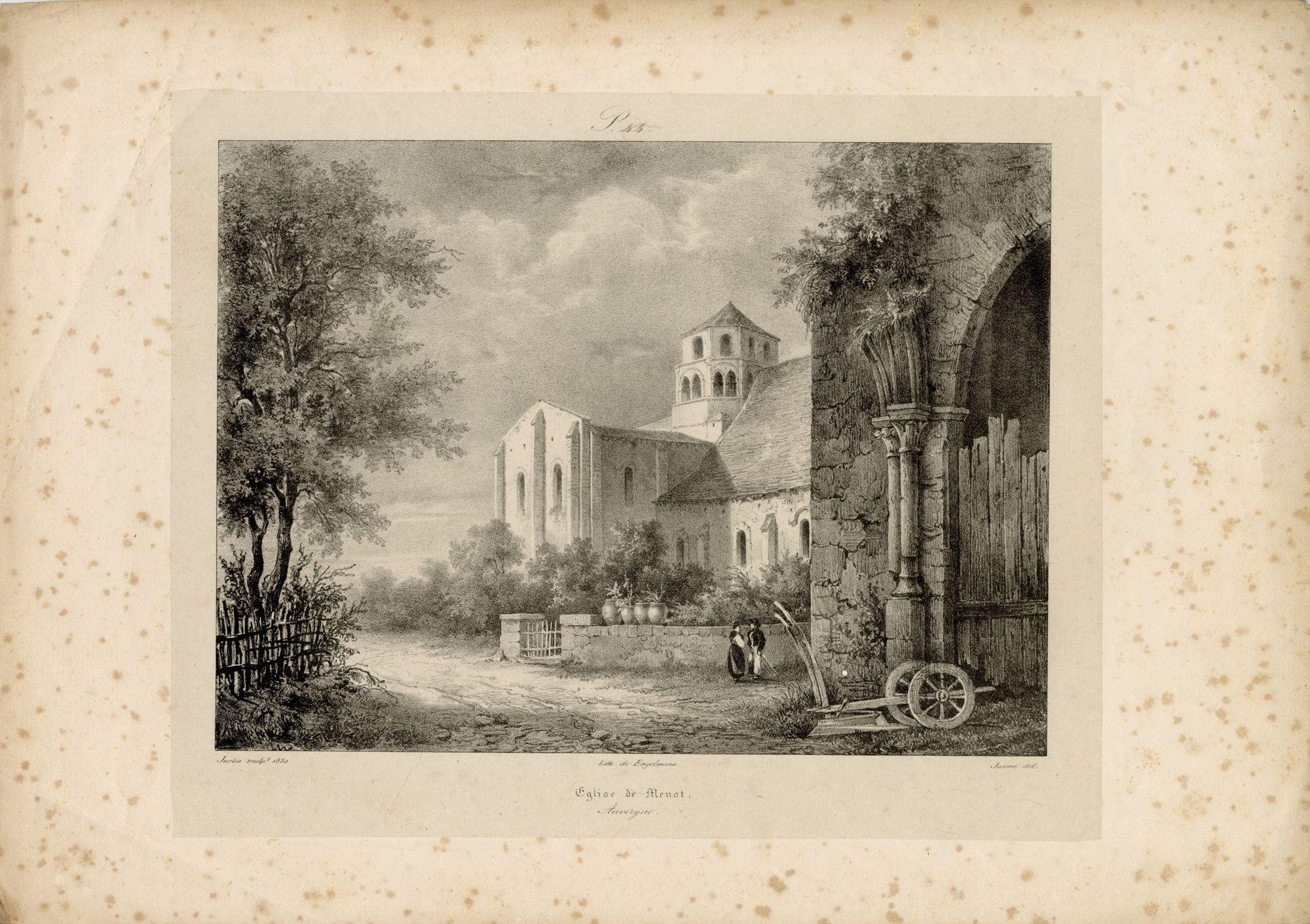 "Eglise de Menat, Auvergne" (personnages et char auvergnat au premier plan). - Dessin Jaime, gravure Justin (1830) ; lithographie de Engelmann. - 29 x 40 cm.