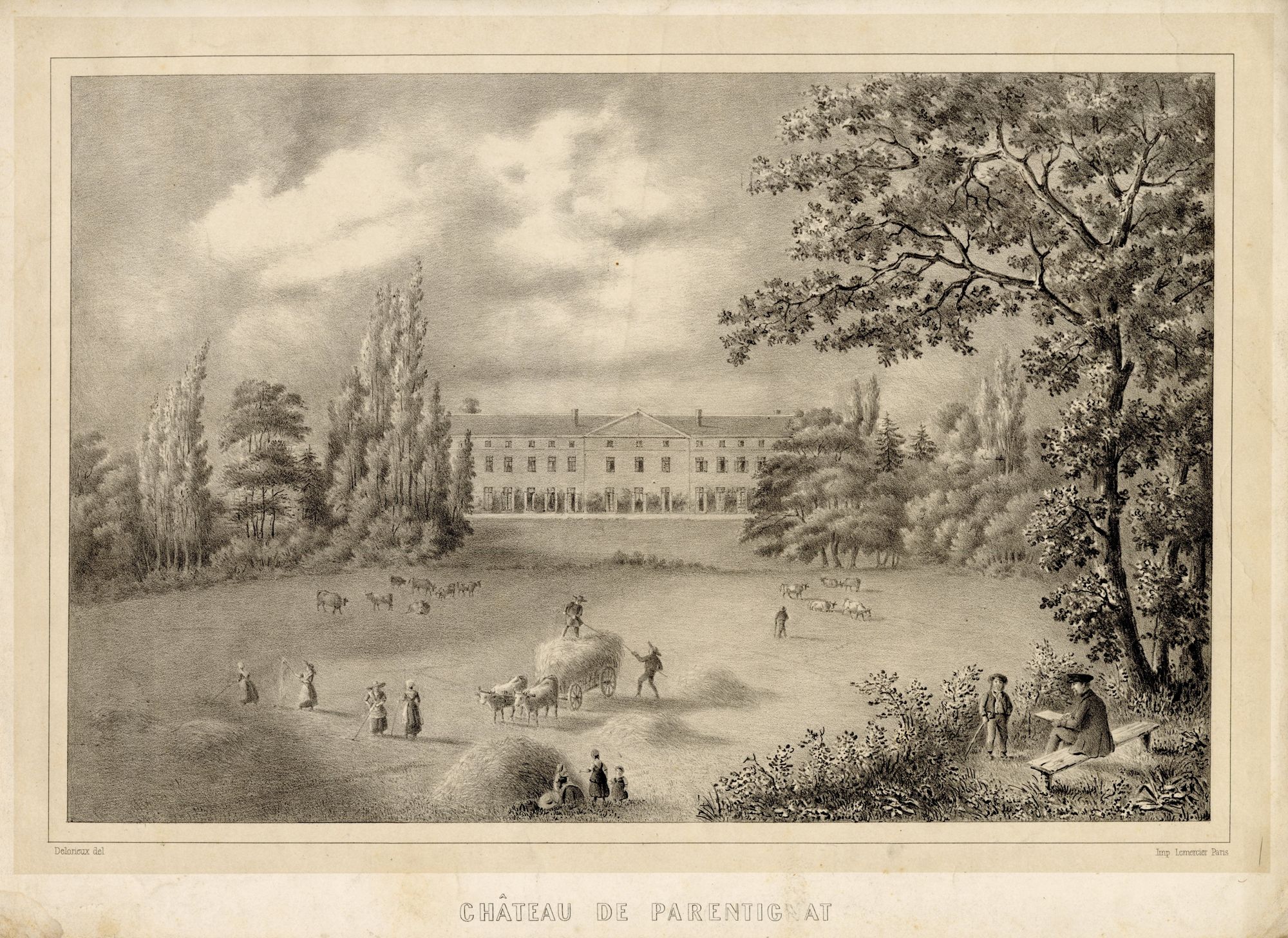 340. "Château de Parentignat" (en premier plan, on fait les foins). - Dessin Delorieux ; imprimerie Lemercier, Paris. - Gravure, 27 x 37 cm ;