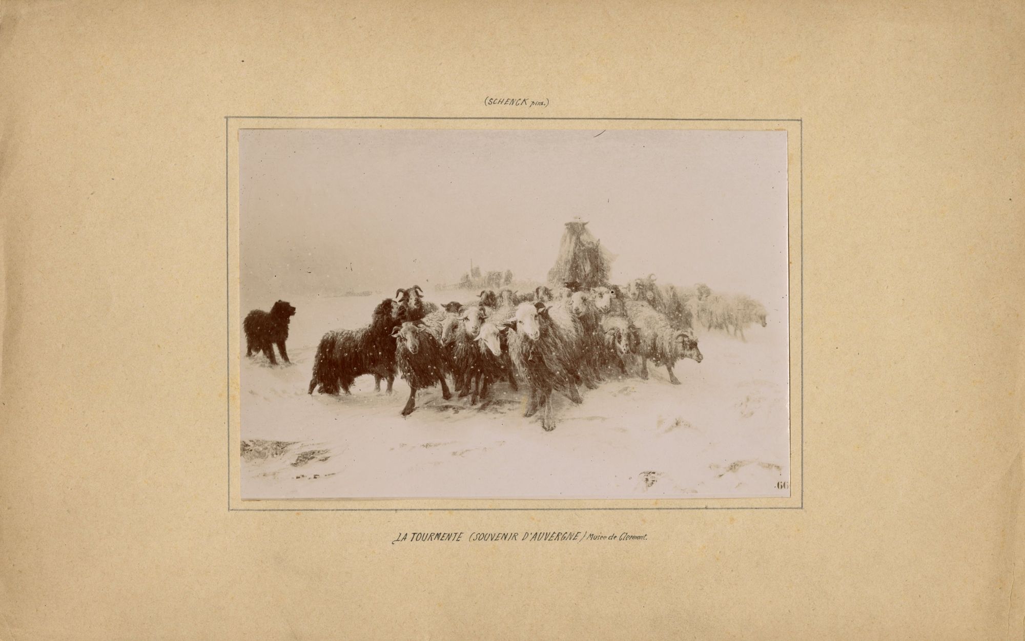 28 J 2/209, "La Tourmente (Souvenir d'Auvergne). Musée de Clermont", troupeau de moutons dans une tempête de neige. - Reproduction d'une toile de Schenck, 12 x 17 cm.
