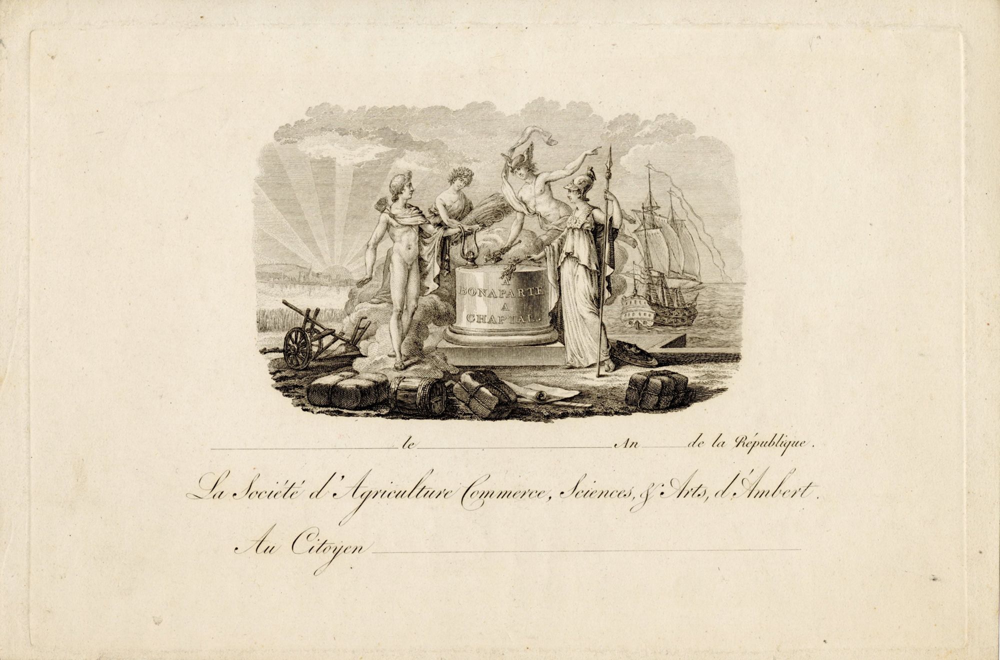 249. Imprimé portant "[...] le [...] An[...] de la République" et "La Société d'Agriculture, Commerce, Sciences et Arts d'Ambert au Citoyen...", avec une gravure : offrandes "à Bonaparte, à Chaptal". - 18 x 27 cm ;