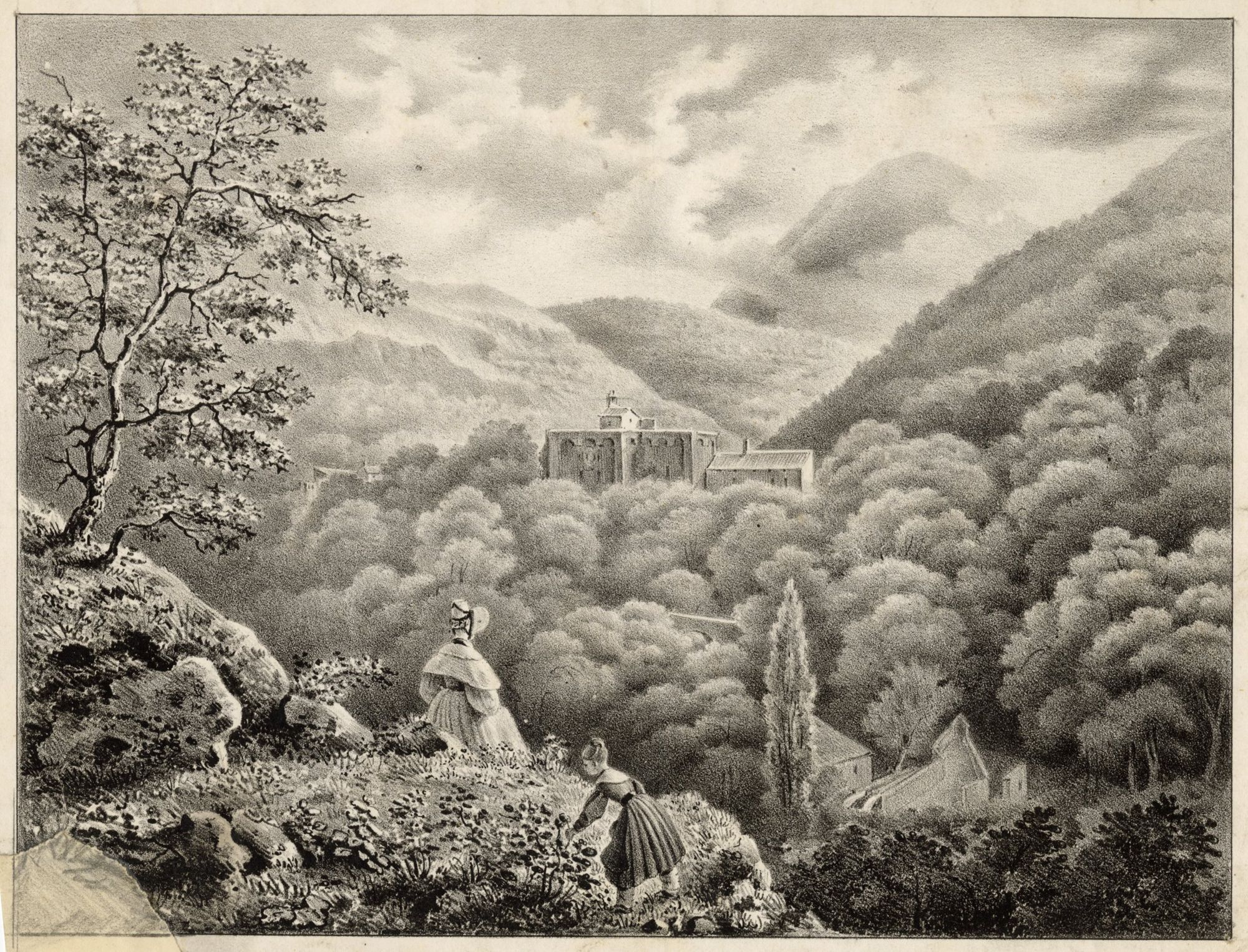 329. "Vallée de Royat. Etude peinte d'après nature par Bohomme et lithographiée d'après son tableau". Route et personnages au premier plan. - 23 x 30 cm ;