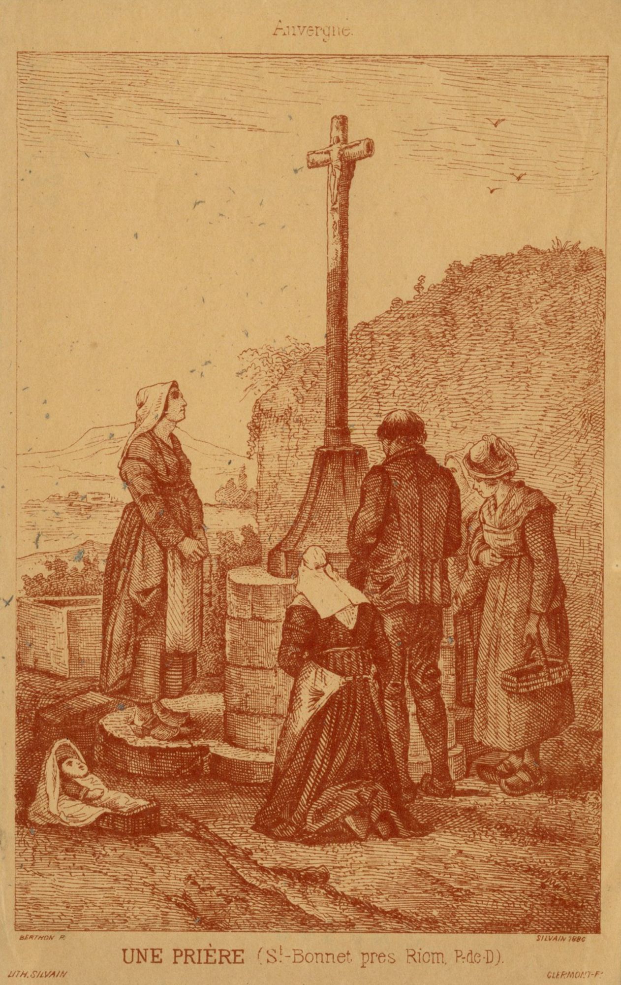 "Une prière (St-Bonnet près de Riom, P.-de-D.)", paysan, paysannes au pied d'une croix. - Dessin Berthon P. ; lithographie Silvain, 1896, Clermont-Ferrand. - 17 x 11 cm.