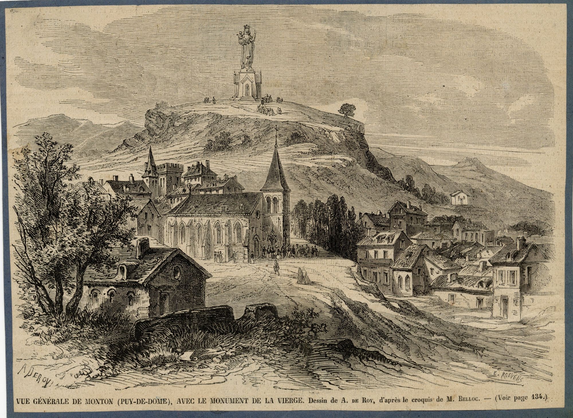 "Vue générale de Monton (Puy-de-Dôme), avec le Monument de la Vierge. Dessin de A. Deroy, d'après le croquis de M. Belloc". - Gravure, 16 x 22 cm.