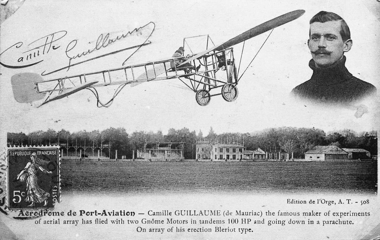 - 1-6 : Verso d'une carte postale adressée par Camille Guillaume à M. Bouny, rédacteur en chef du "Réveil de Mauriac" : "Aérodrome de Port-Aviation - Camille Guillaume (de Mauriac)". - Editions de l'Orge A. T. - 508 (1912)