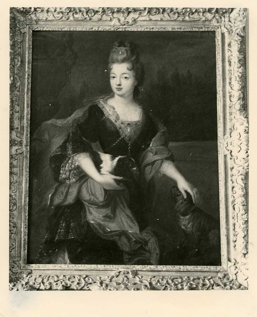 45 Fi 14399, Portrait de femme avec cadre en bois doré, époque Louis XIV, situé dans la chambre du premier étage. - Cliché André Muzac. - N. et b.