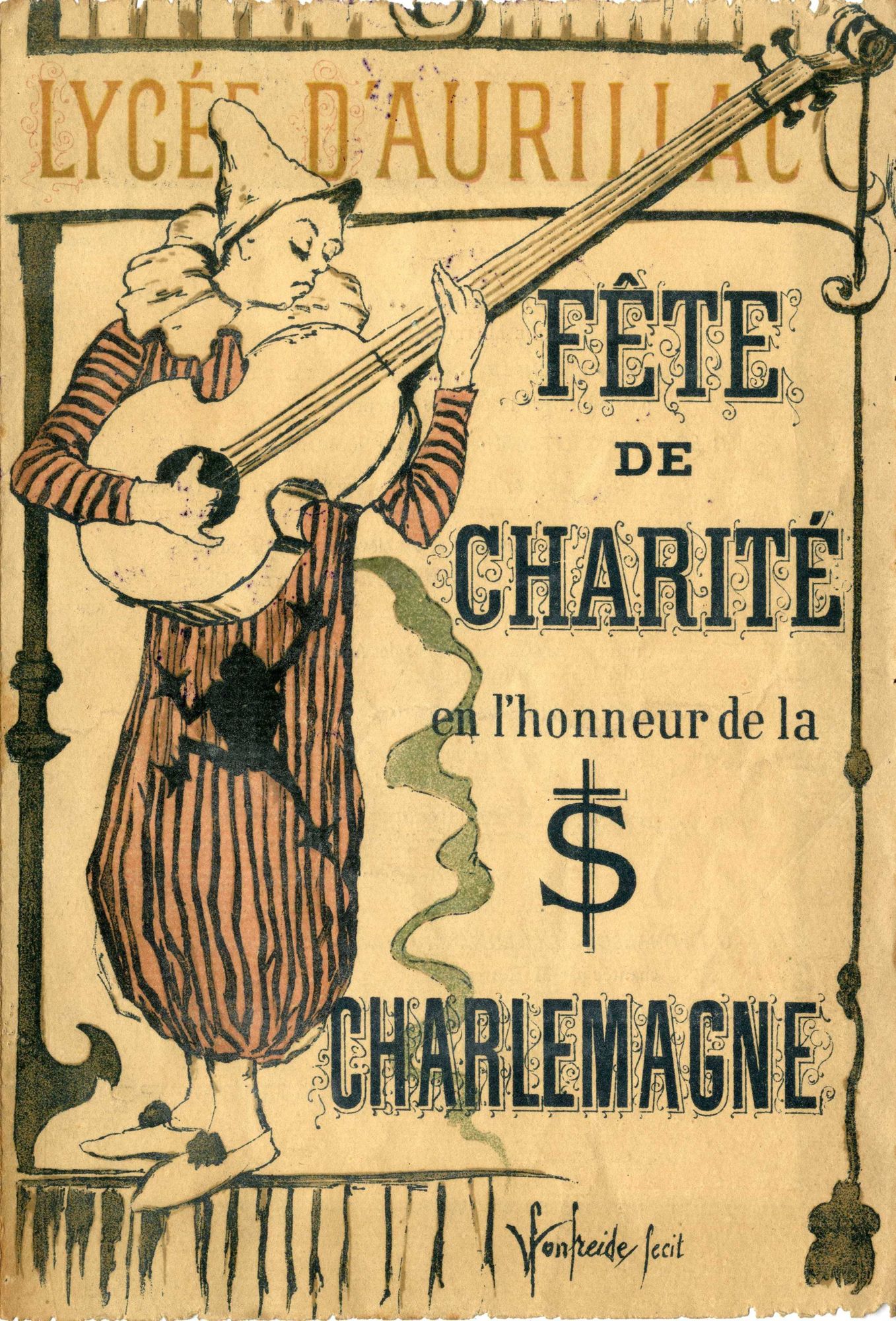 40 Fi 2529, Lycée d'Aurillac : programme de la fête de charité en l'honneur de la saint Charlemagne, illustré par Victor Fonfreide. - Imprimerie R. Terrisse à Aurillac.