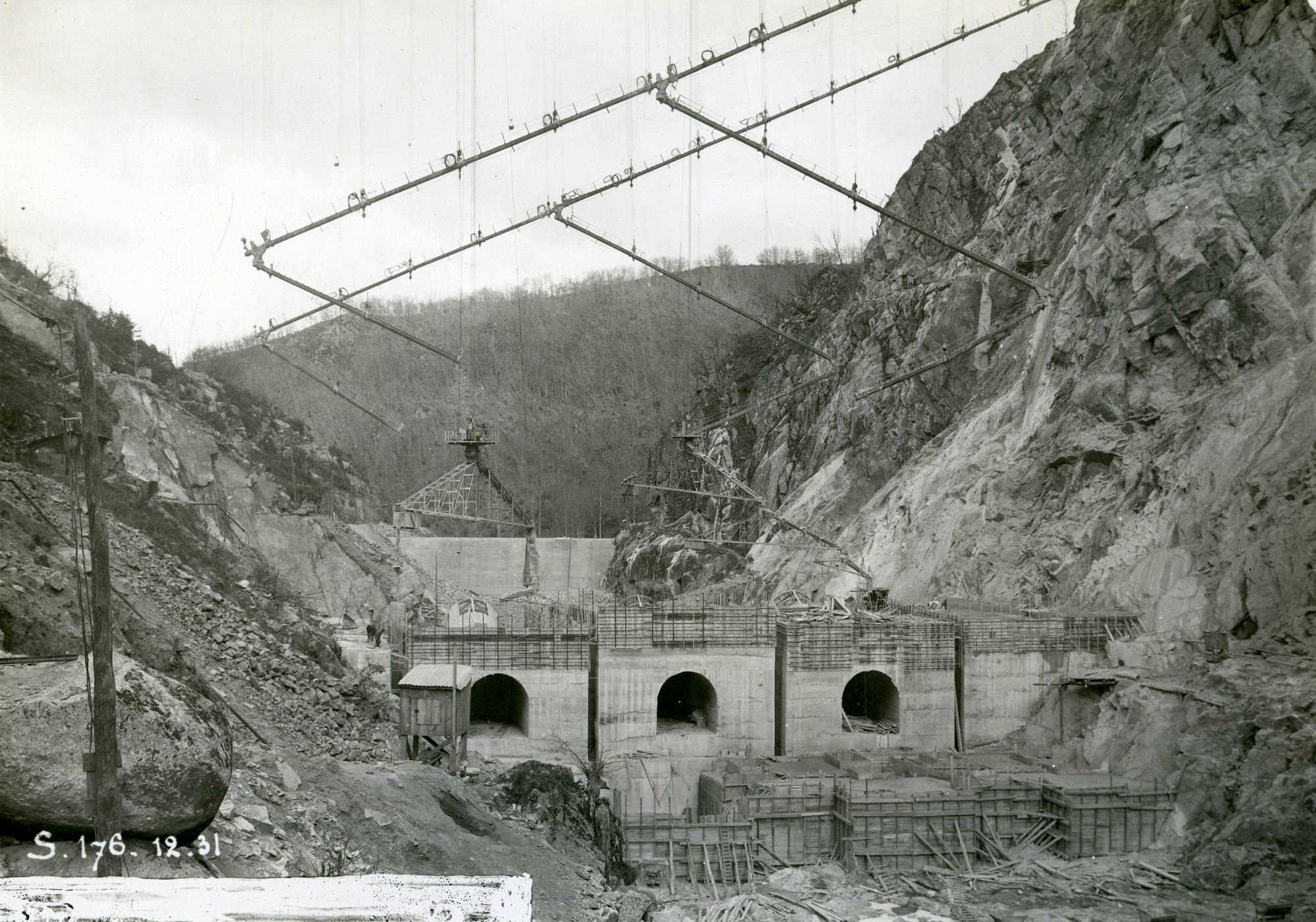 23 NUM 808, Barrage en construction vu de l'aval. - Cliché anonyme. - Photographie, n. et b., 18 x 24 cm