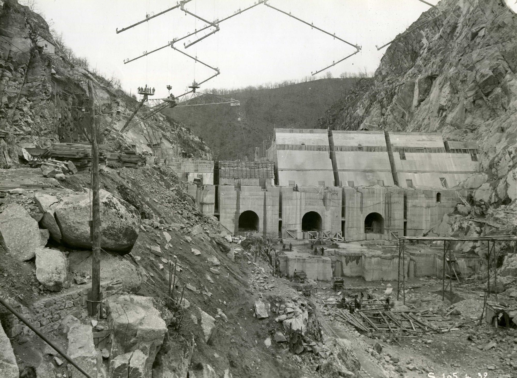 23 NUM 813, Barrage en construction : fondation des turbines, vue prise en aval. - Cliché anonyme. - Photographie, n. et b., 18 x 24 cm
