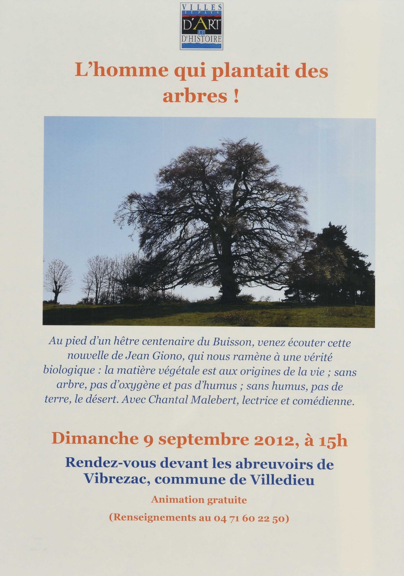 61 NUM 1828, "L'homme qui plantait des arbres !" Au pied du hêtre centenaire du Buisson, venez écouter cette nouvelle de Jean Giono, qui nous ramène à une vérité biologique : la matière végétale est aux origines de la vie ; sans arbre, pas d'oxygène et pas d'humus ; sans humus, pas de terre, le désert. Avec Chantal Malebert, lectrice et comédienne. Vibrezac, 9 septembre 2012.