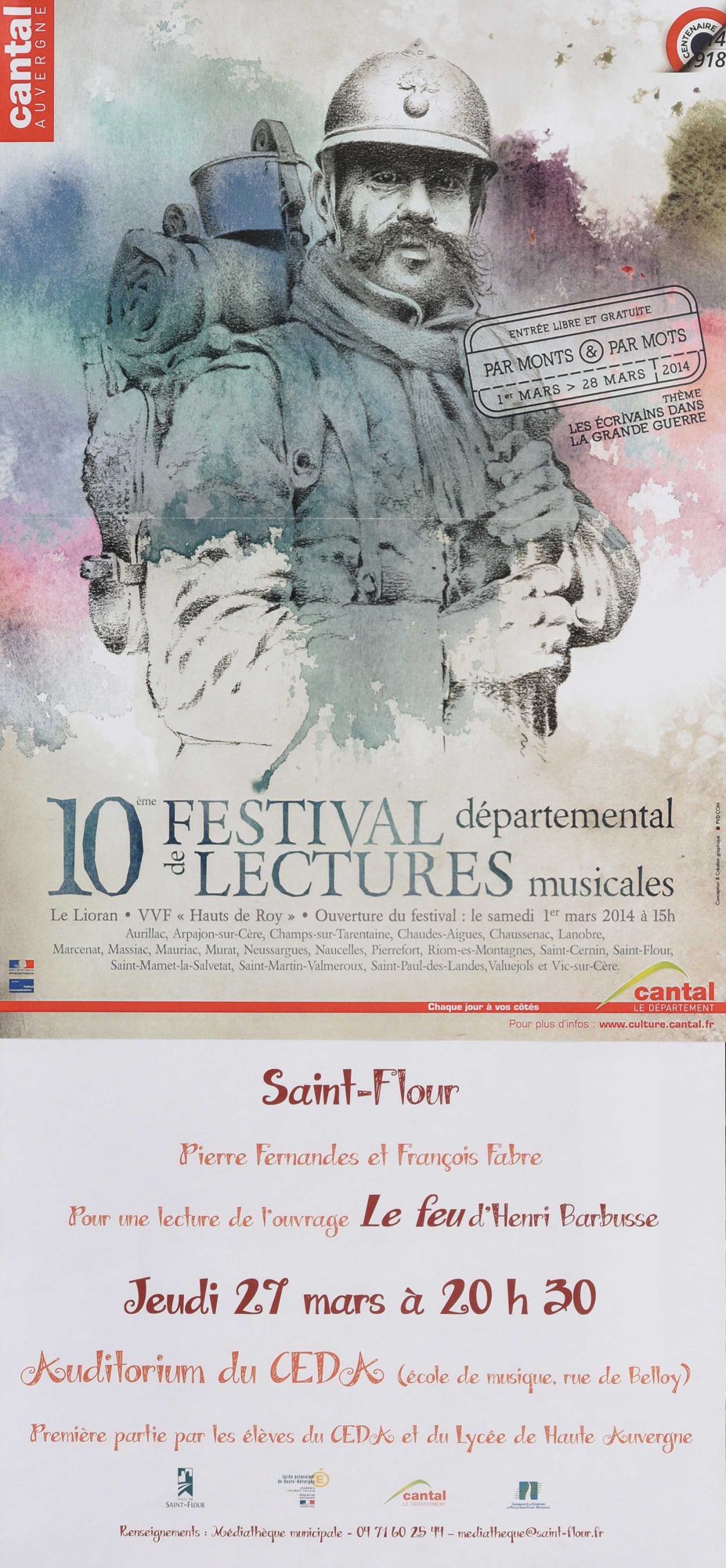 61 NUM 1962, 10e festival départemental de lectures musicales "Par monts et par mots". Pierre Fernandes et François Fabre, pour une lecture de l'ouvrage "Le Feu" d'Henri Barbusse. Saint-Flour, auditorium du CEDA, 27 mars 2014. - Conception et création graphique PUD Com.