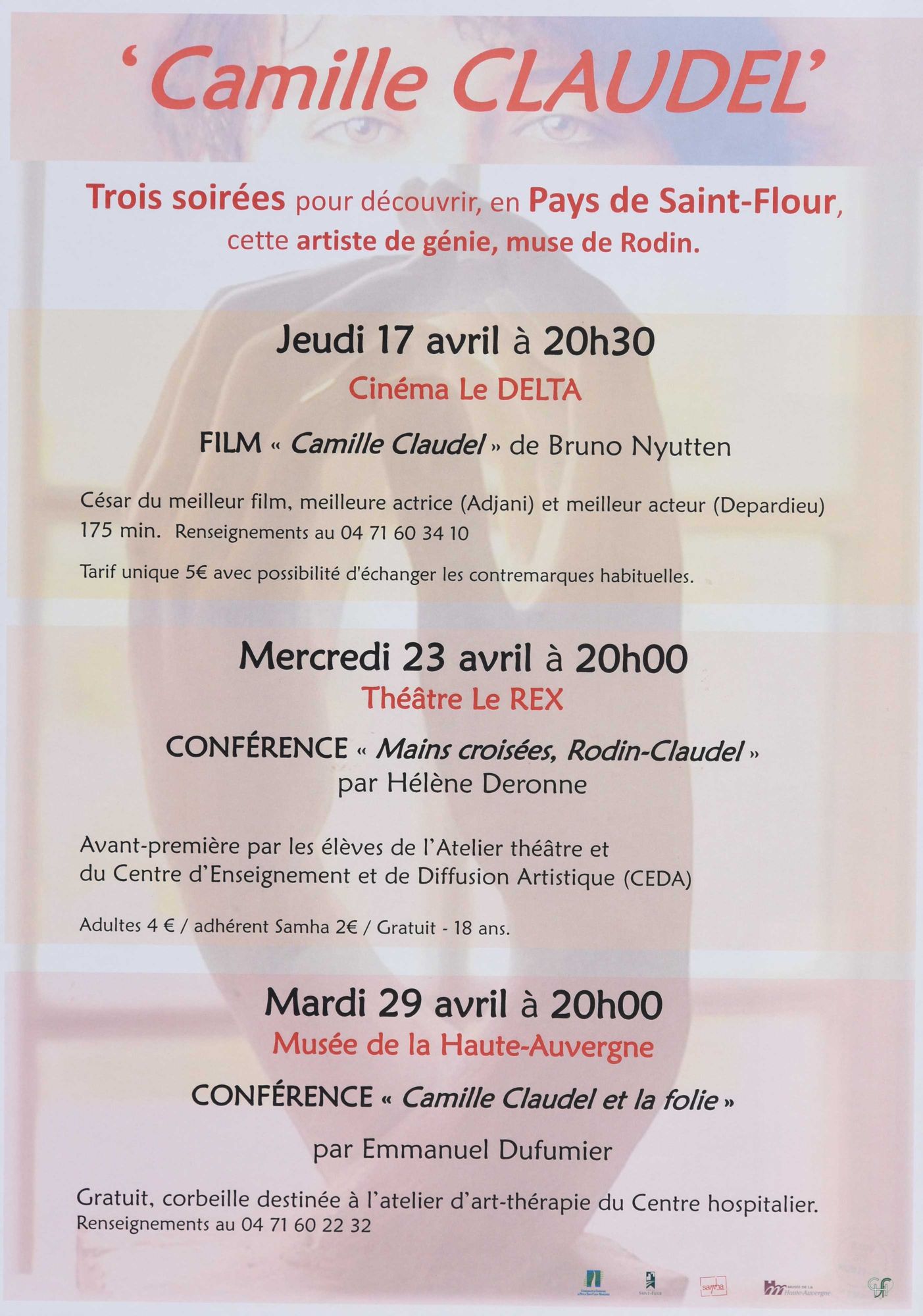 61 NUM 1972, "Camille Claudel". Trois soirées pour découvrir, en Pays de Saint-Flour, cette artiste de génie, muse de Rodin. Cinéma Le Delta, film "Camille Claudel" de Bruno Nyutten, 17 avril 2014. Théâtre Le Rex, conférence "Mains croisées, Rodin-Claudel", par Hélène Deronne, 23 avril 2014. Musée de la Haute-Auvergne, conférence "Camille Claudel et la folie" par Emmanuel Dufumier, 29 avril 2014.