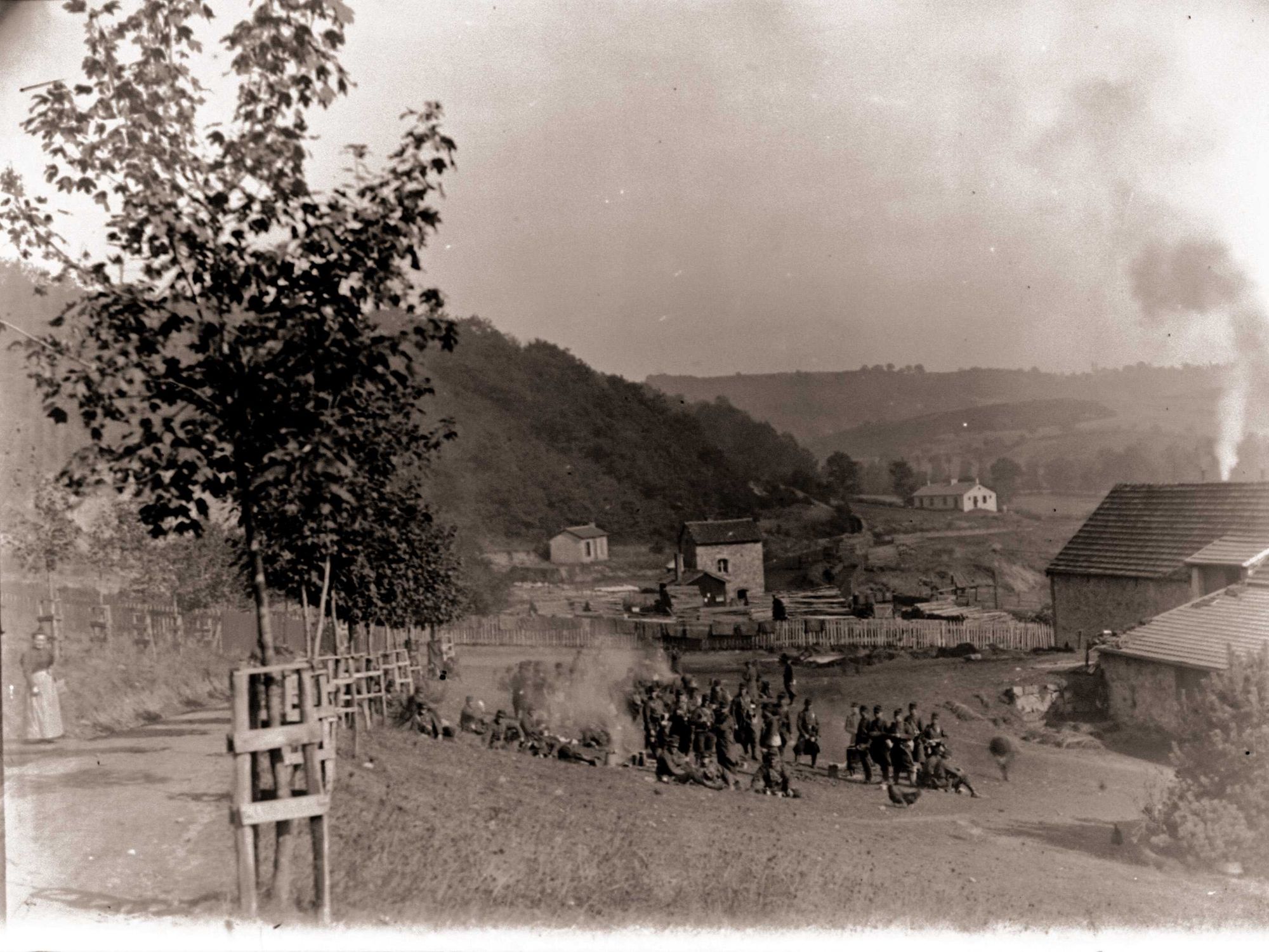 67 NUM 1278, Grève de 1895 : compagnie du 139e régiment d'infanterie d'Aurillac dans le parc des écuries de la mine. - Cliché Pochat.