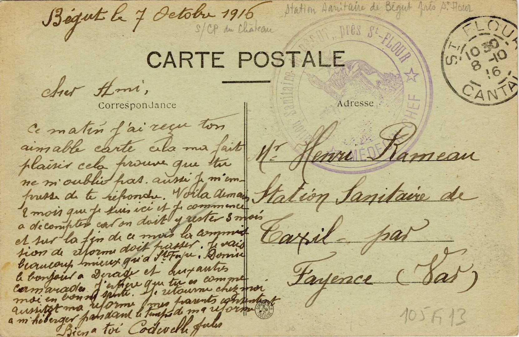 105 Fi 13, Carte postale portant la marque "Station Sanitaire de BEGUT, près St-FLOUR" ; au recto : "L'Auvergne - Saint-Flour - Station Sanitaire du Château de Bégut (Militaires convalescents)". - Editions L. Delpine, Saint-Flour.105 Fi 13, Carte postale portant la marque "Station Sanitaire de BEGUT, près St-FLOUR" ; au recto : "L'Auvergne - Saint-Flour - Station Sanitaire du Château de Bégut (Militaires convalescents)". - Editions L. Delpine, Saint-Flour.